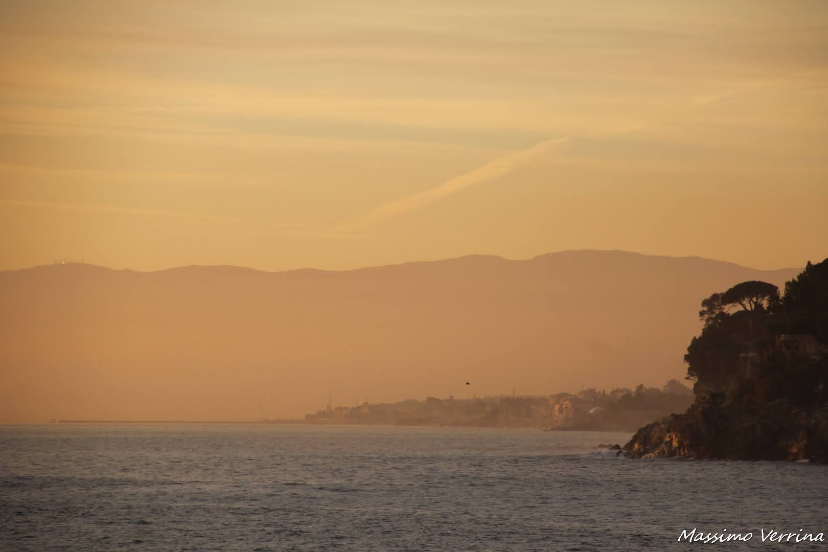 Con la suggestiva immagine che state per vedere vi porto nel freddo di una sera d’inverno. Il vento teso che scende dai monti sul ponente ligure e da tutto il Golfo di Genova, trasporta l’umidità delle valli interne, creando una foschia che sembra scivolare nei bassi strati come fumo di un lontano incendio. Il colore del tramonto illumina questa scenografia creando un effetto davvero particolare che potete osservare in tutta la sua meraviglia…