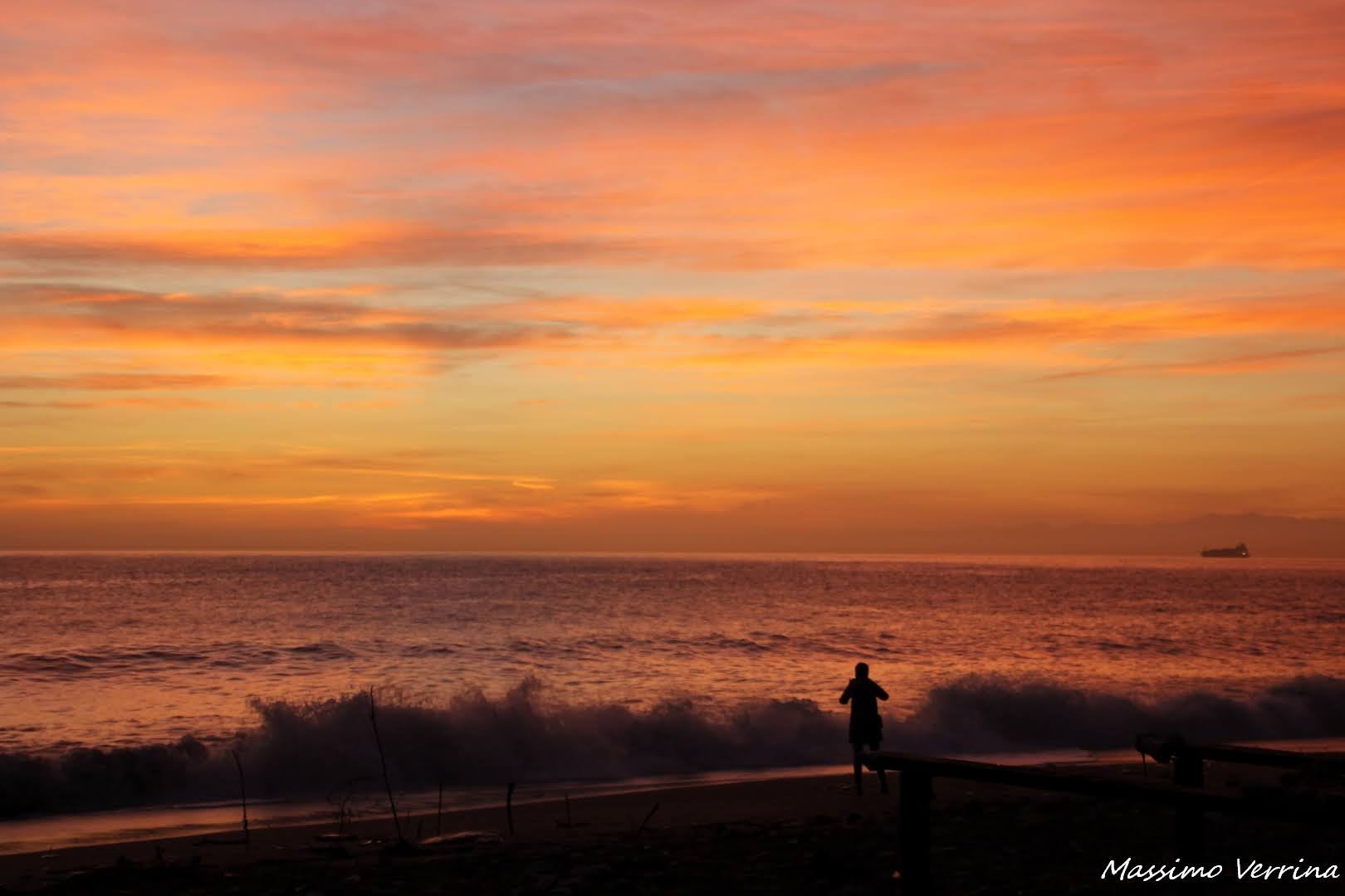 Poco più avanti sulla battigia una donna scappa da un’onda, la vedo correre all’indietro col mare che gioca ai suoi piedi. Sola nel tramonto, avvolta dal piacere di quel mare che troppo ama, diventa un sospiro di vita fra le braci del tramonto…