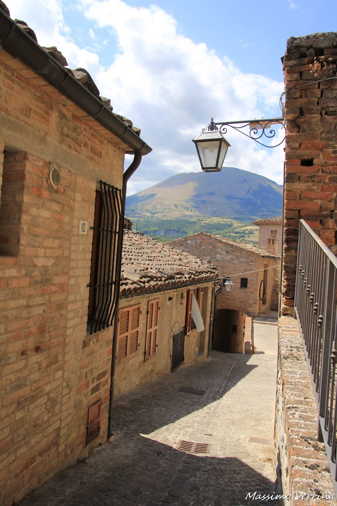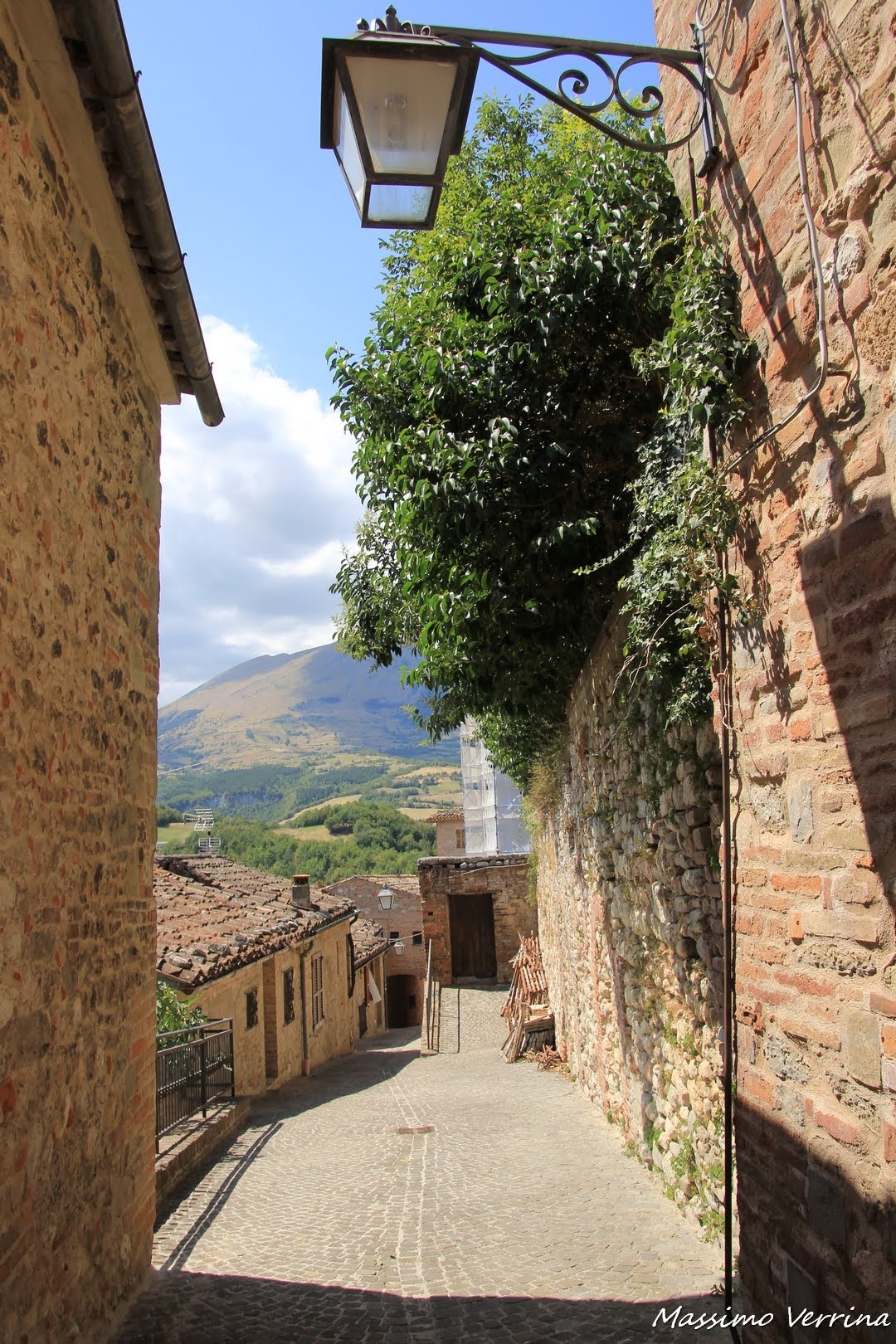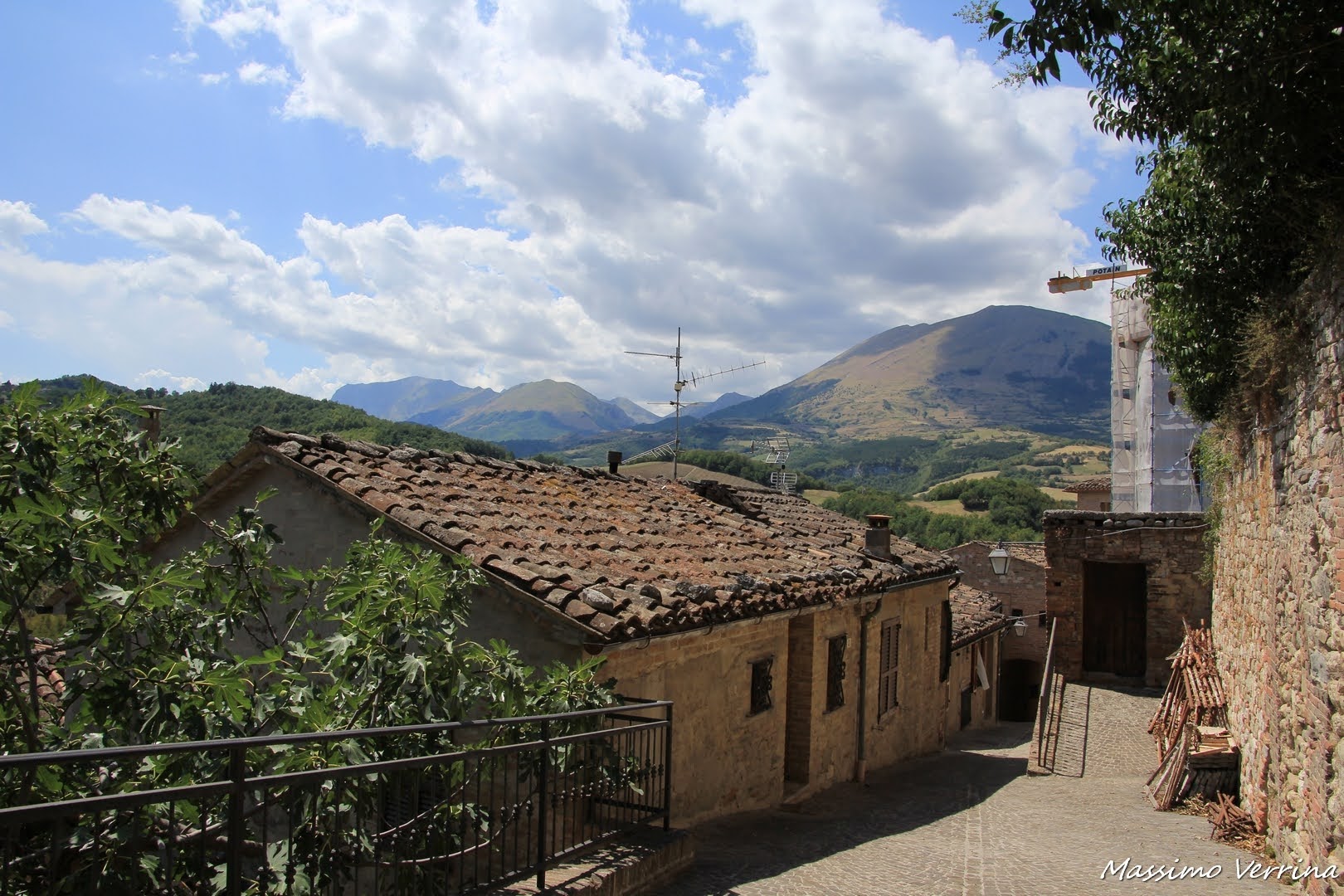 Questo borgo è tutto in salita, costruito su più livelli, partendo dalla strada provinciale più in basso che da qua ancora non si vede. Mi affaccio ad un muretto dal quale si può osservare la via sottostante, la parte frontale di un’altra chiesa, e l’ampio paesaggio dei monti. Respiro aria pura e mi concedo qualche attimo di relax osservando il panorama…