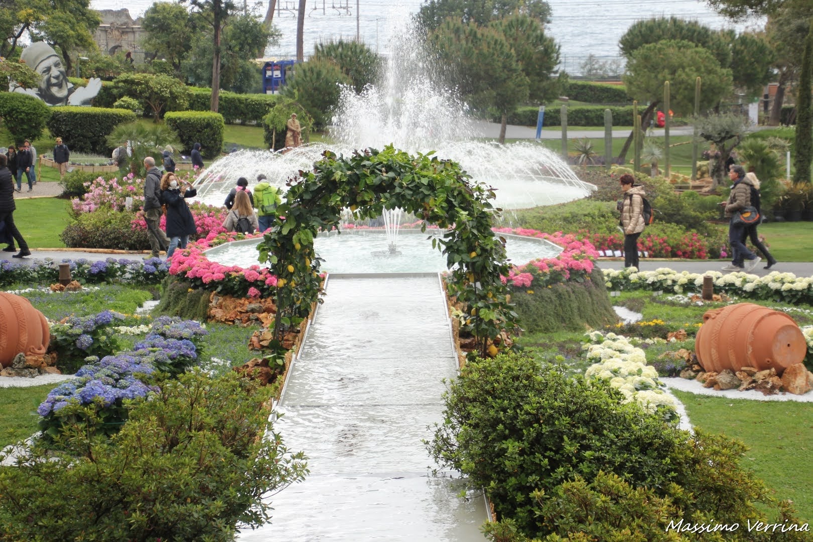 Ed ora vi faccio vedere i giochi d’acqua, una delle attrazioni più fotografate e filmate, se vedete un filmato sull’Euroflora sicuramente vedrete questo punto. Si tratta di una cascata con più salti che va ad alimentare un’altra vasca con una grande fontana. Purtroppo il cielo grigio di quel giorno ha rovinato la bellezza di questo scatto….