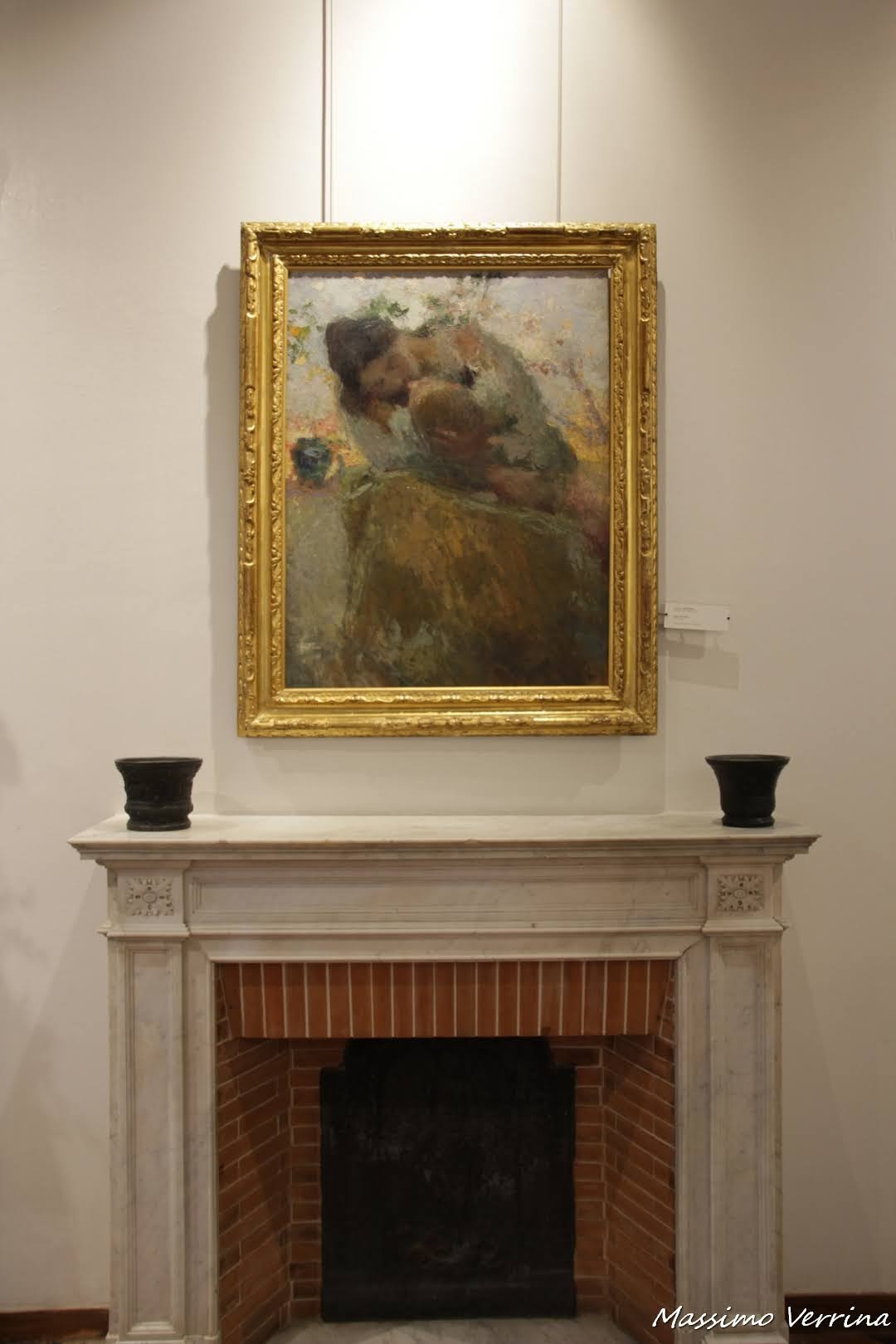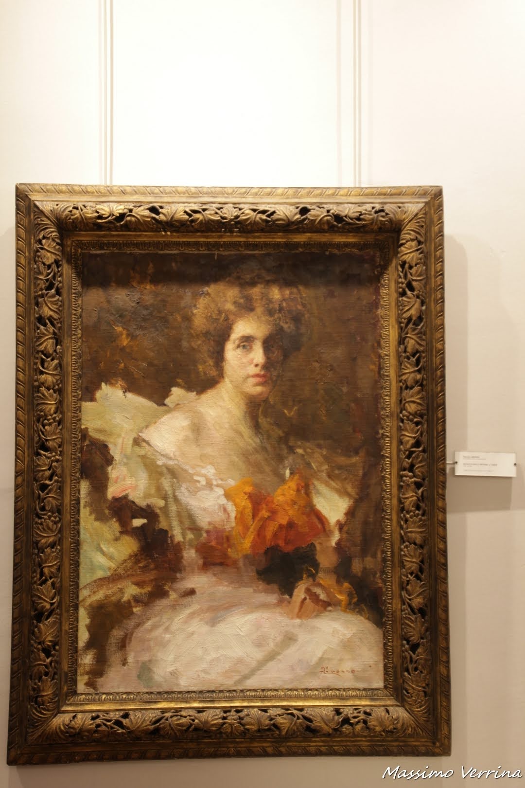 Andiamo ora a vedere da vicino il dipinto sulla parete, è il ritratto della Signora Carriè, un’opera di Giacomo Grosso del 1860, ciò che ci colpisce è la luce che è stata rappresentata, in puro stile fotografico, con quell’ombra che sembra occultare una parte del viso, per una luce che intuiamo provenire da una finestra sul lato. Anche l’espressività con quell’aria stupita fa di quest’opera una grande pagina di leggiadra bellezza….