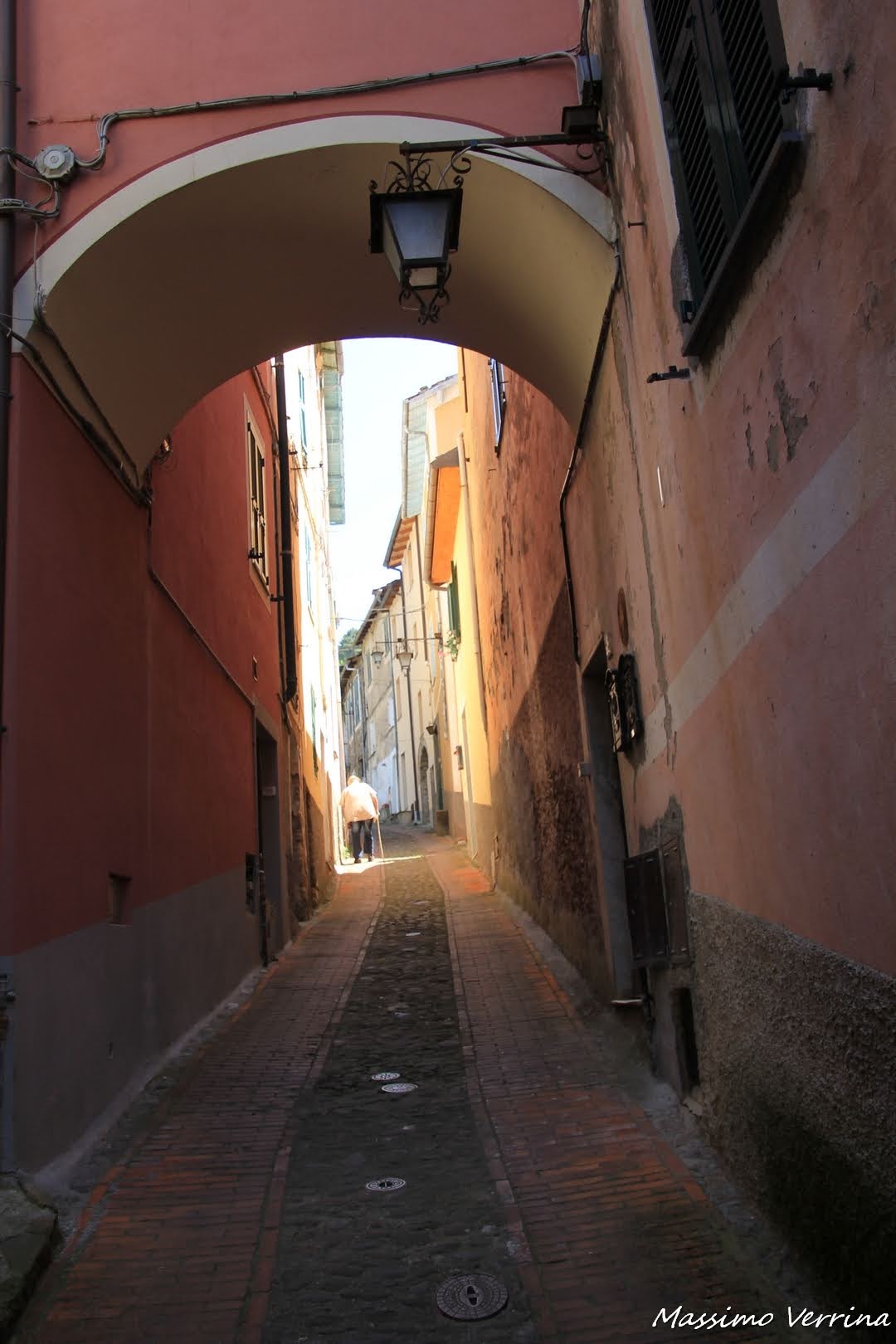 Arrivati verso la fine della parte in ombra ci troviamo nella parte più alta del borgo, ecco come appare guardando verso il cuore del borgo, con quel passaggio ad arco dentro al quale c’è una casa. Pensate un po’ chi passa dentro quella stanza collega due case differenti, molto singolare questa cosa, è come abitare in due abitazioni distinte…