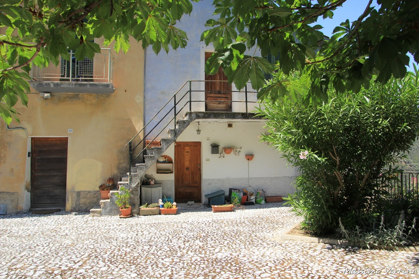 Ed ecco la sorpresa, in cima a quella contrada si apre uno spazio molto vasto una terrazza panoramica col fondo composto da ciottoli bianchi, è un ambiente colmo di luce sul quale si affaccia una casa. Visto così potrebbe sembrare il giardino di quella singola dimora, invece è uno spazio pubblico dal quale si può ammirare il verde della vallata alle spalle del borgo…