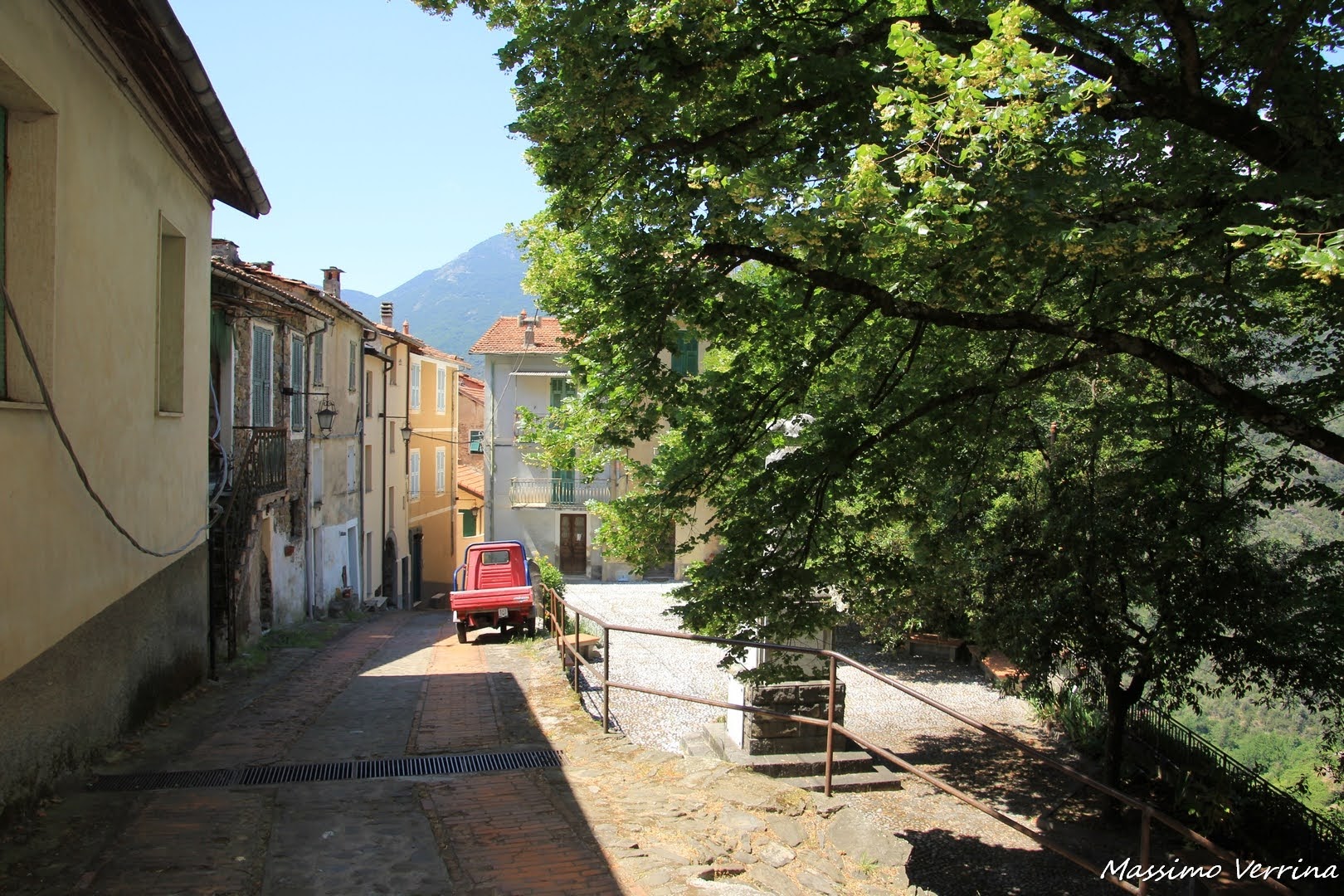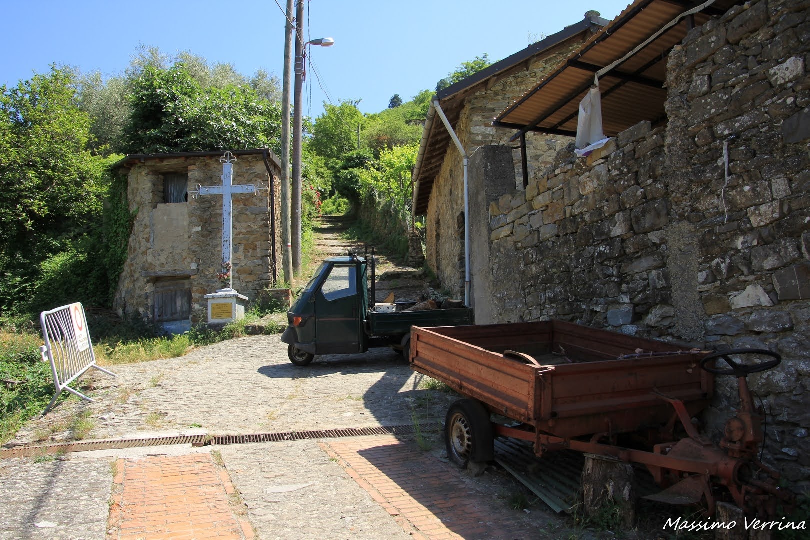 Da quella croce termina il borgo e inizia il sentiero che conduce verso altre destinazioni, alcune molto lontane. In Liguria ci sono moltissimi sentieri escursionistici, certo percorrerli d’estate è mortale, nel senso che con questo caldo c’è davvero da sentirsi male, e pensare che io in gioventù durante l’estate avevo fatto quasi tutta l’alta via dei monti liguri, ma forse in gioventù pativo meno, o forse non c’era il caldo di quest’anno…..