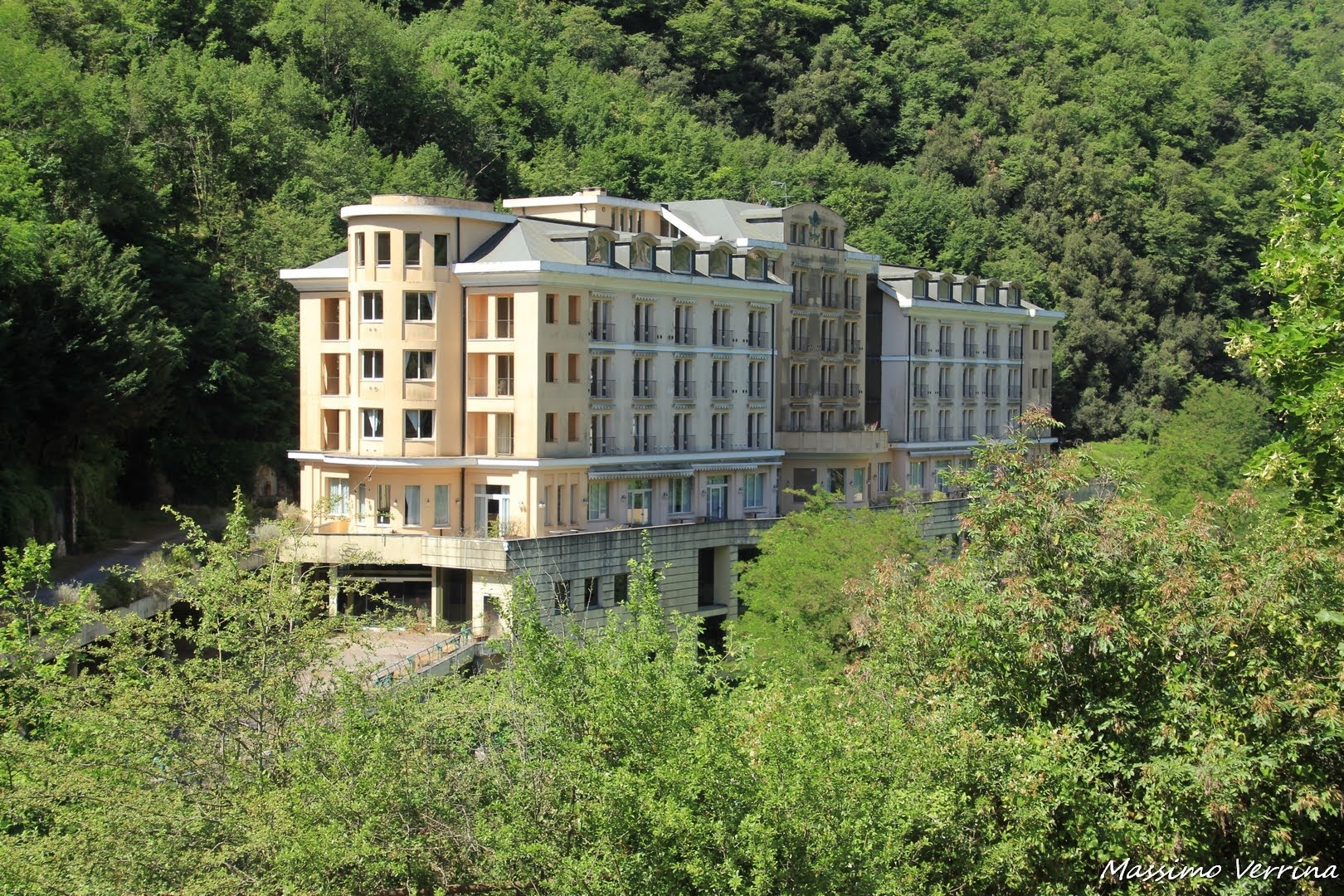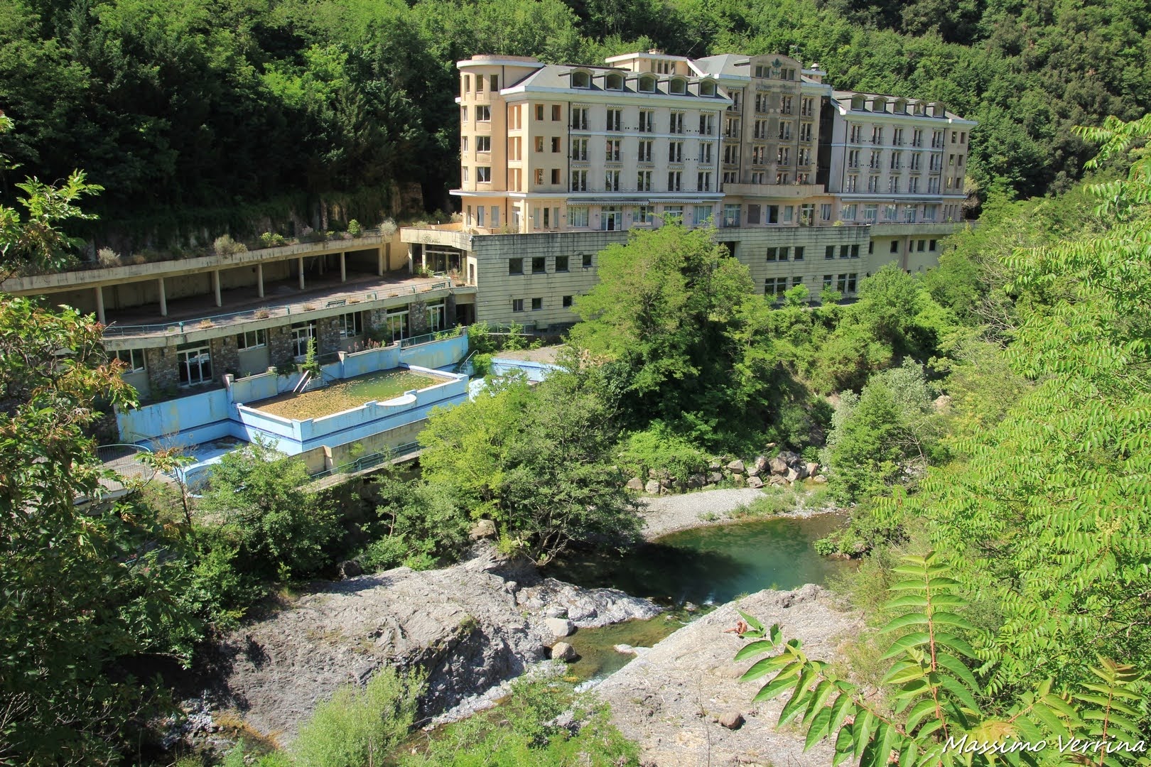 Risalgo per la strada delle macchine, prima di giungere al bivio del sentiero, lì incontro la ragazza più simpatica di tutta quella giornata, la vedo camminare al centro della strada, la temperatura era di 32°C, appena mi vede con fare teatrale si mette a gridare da lontano “Che caldo!! Madonna che caldo!! Si muore!” Troppo simpatica, la pensavamo uguale, lei scendeva dal sentiero che avrei percorso io in salita, era l’unica oltre me che aveva scelto di camminare a piedi per quel sentiero. Ci siamo scambiati qualche parola, poi ognuno è proseguito per la sua strada. Poco più avanti scorgo un vecchio hotel abbandonato, è all’inizio del borgo….