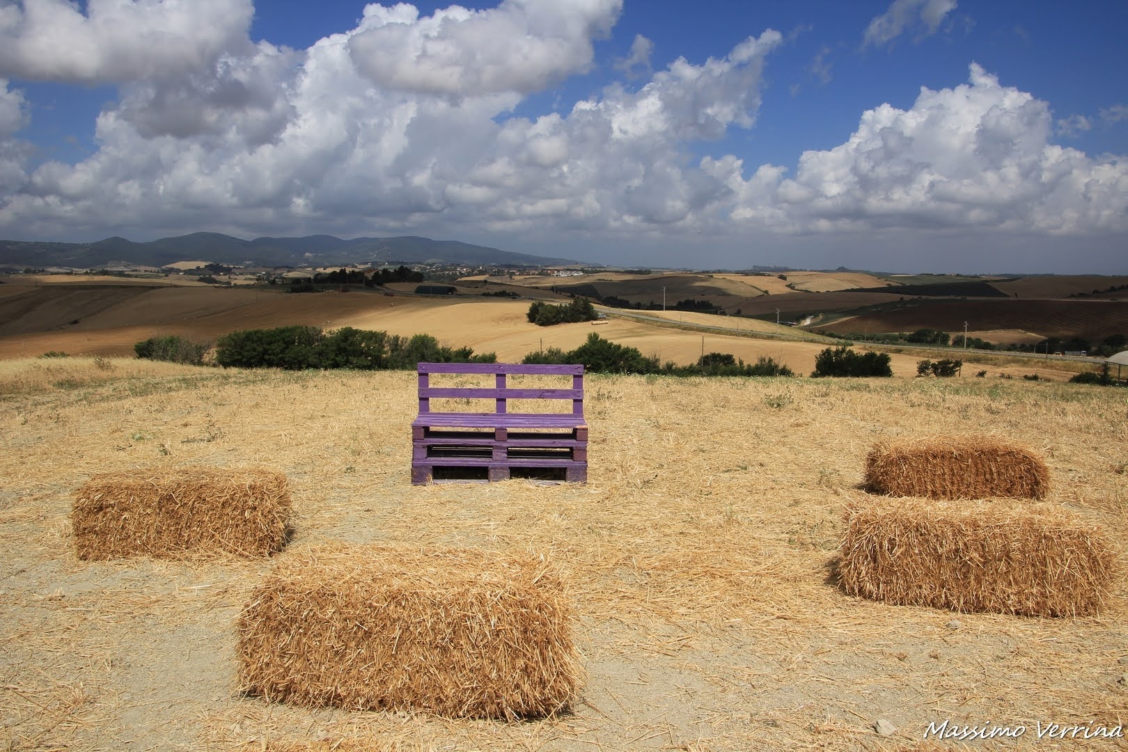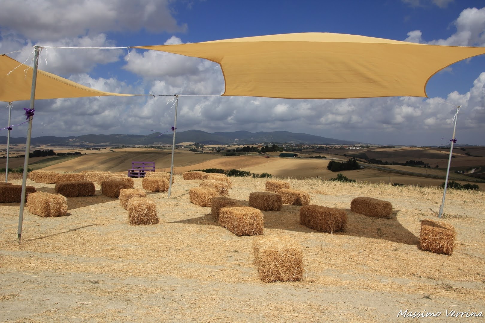2. alcune foto sembrano metafisiche con quegli elementi viola che si vedono isolati nei campi gialli! tranne quella dove sei seduto tu che sei un guizzo di vita in quello scenario deserto! adoro le foto con le nubi che passano disegnando ombre sul terreno collinare: sono uno spettacolo!!! E qualcosa di onirico in quella foto con quei tendoni gialli! Bravo Maxilpoeta! buona serata e a domani!