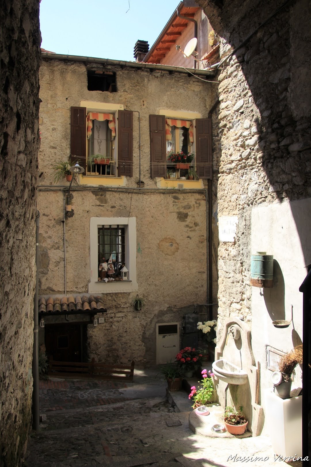 Nel prossimo scatto ci troviamo immersi nel cuore della vita del borgo. Avvolto dai monti, il riflesso della luce penetra nel vicolo in ombra, due donne parlano sedute fuori dalla loro casa per cercare refrigerio nel caldo pomeriggio estivo, un’altra è intenta nelle faccende di ogni giorno. Affreschi di realtà quotidiana che sono essi stessi poesia…