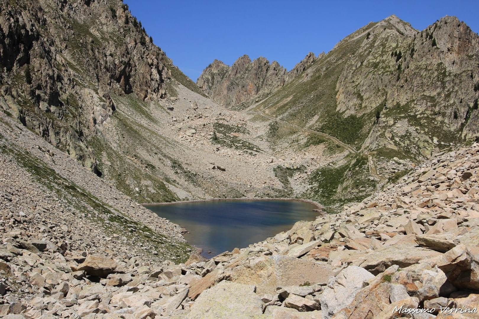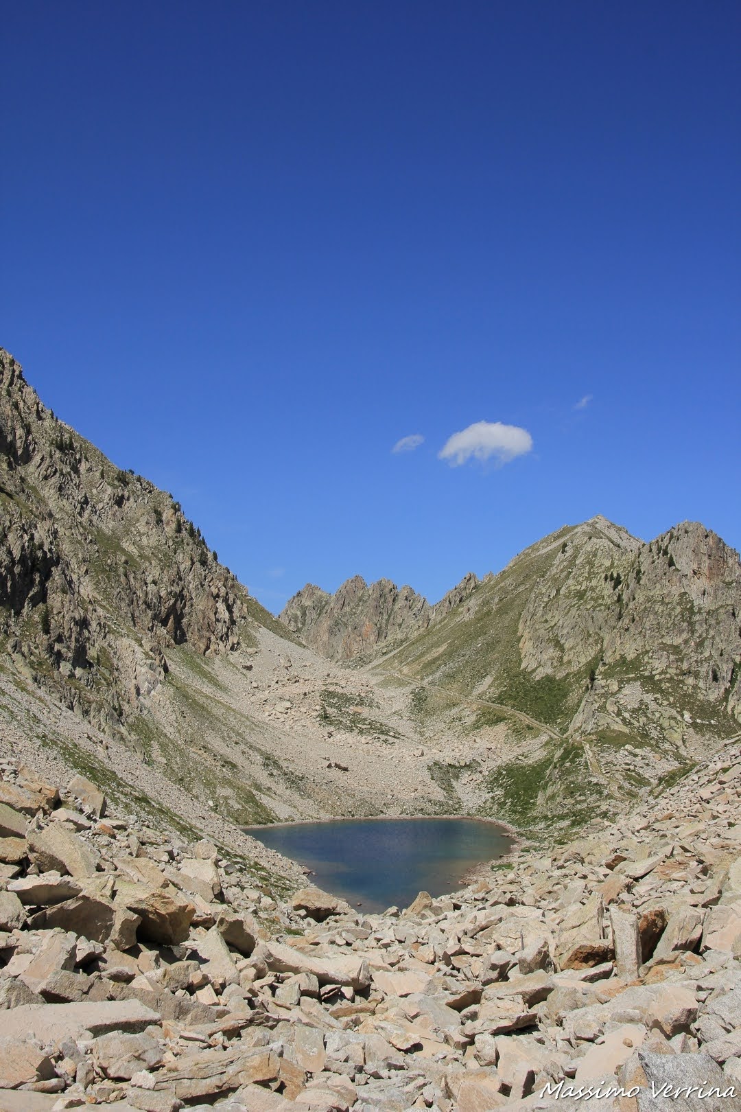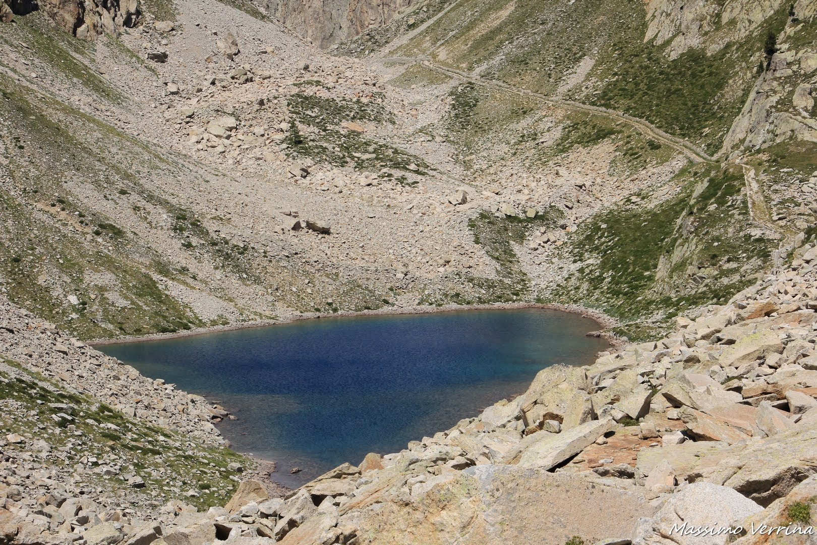 Questo breve tratto è l’unico pianeggiante dell’intero anello, accanto si sente lo sciabordio delle piccole onde create dal vento e il richiamo di alcune marmotte che echeggiava fra le pareti sovrastanti…