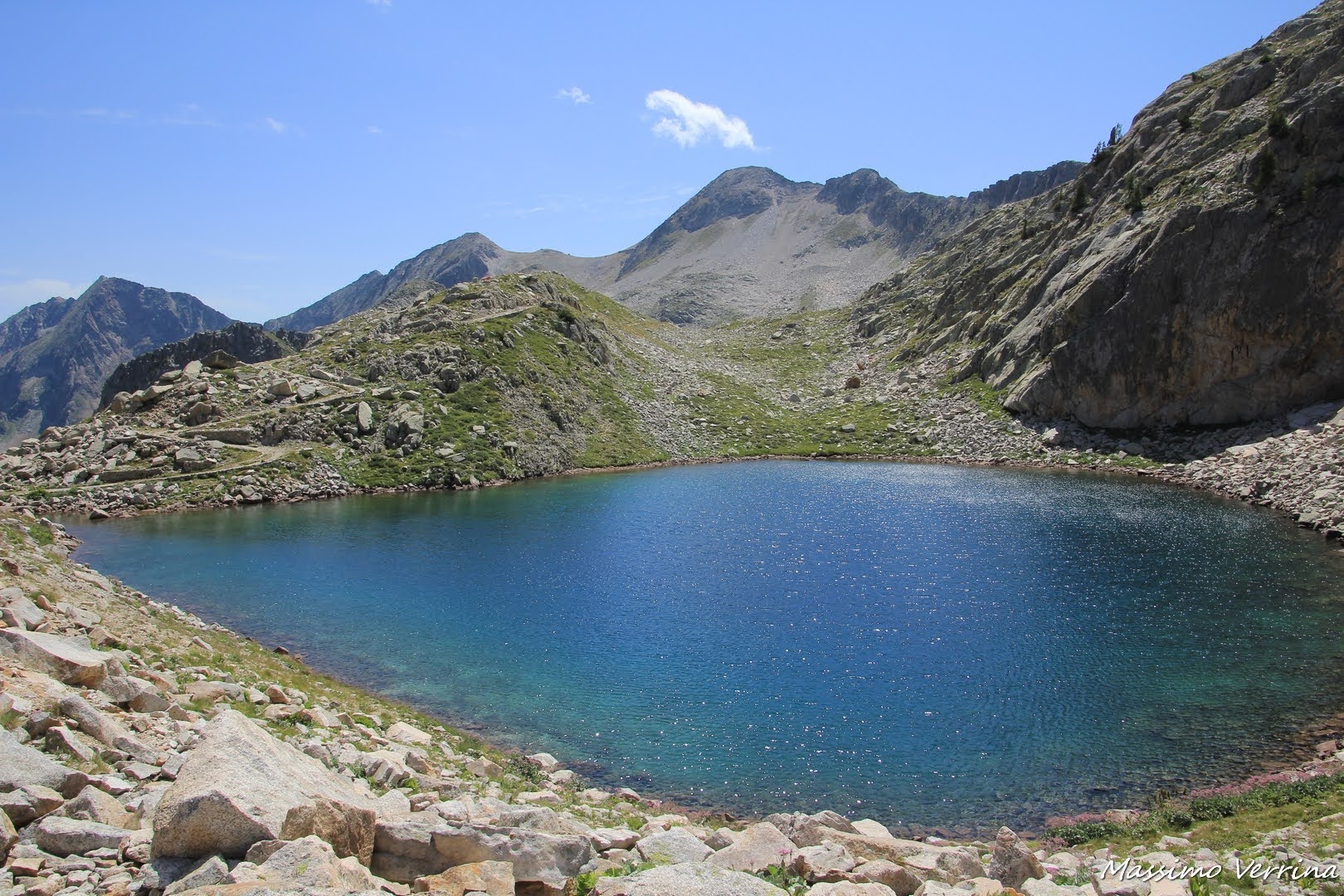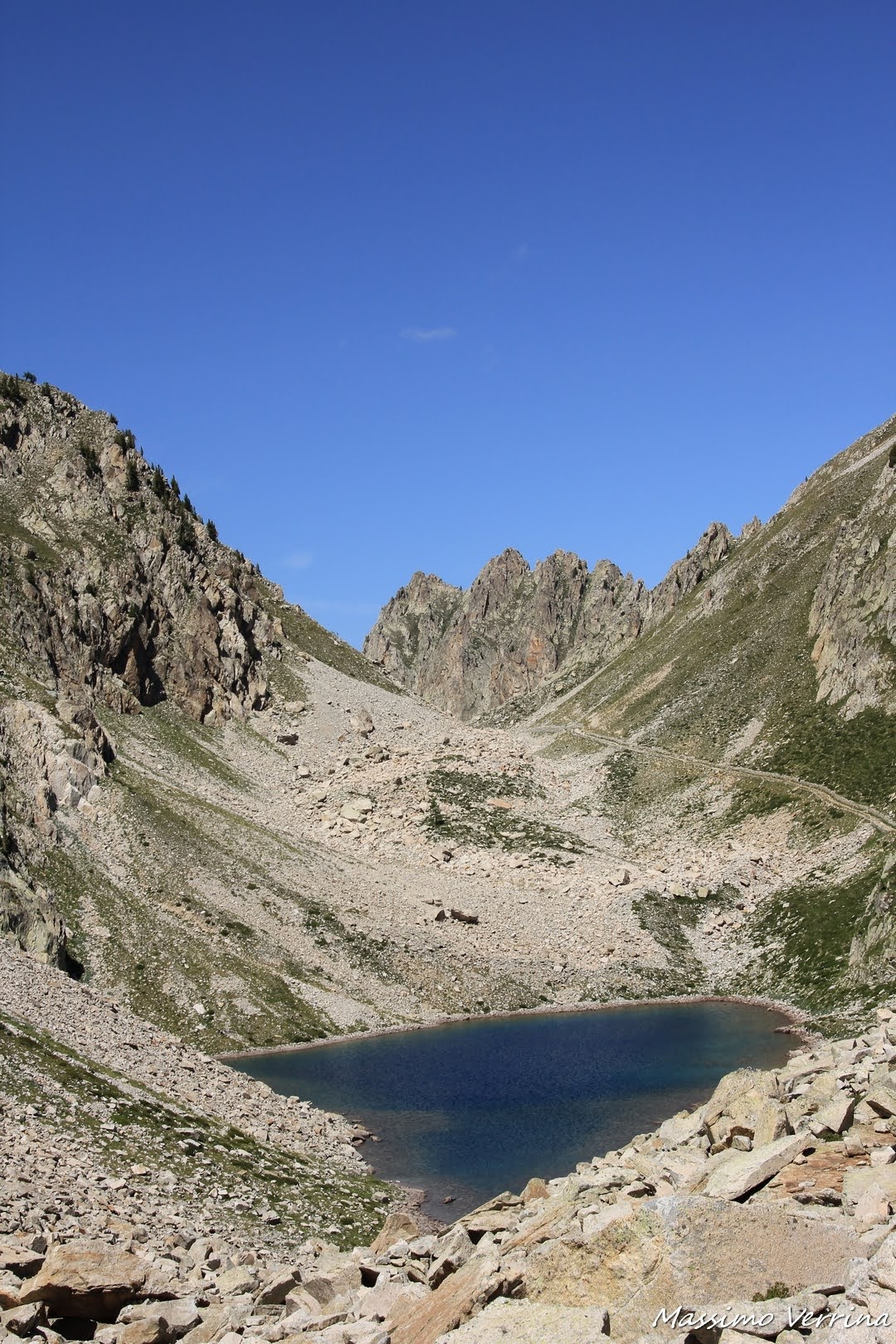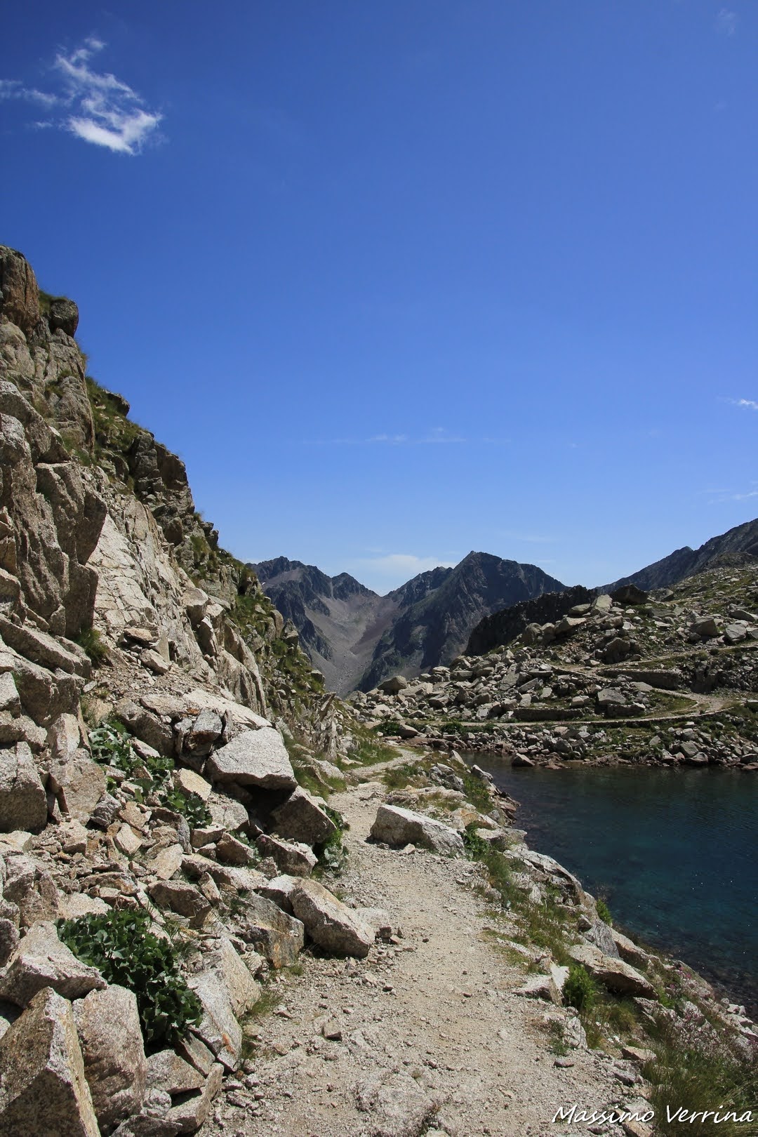 Questo breve tratto è l’unico pianeggiante dell’intero anello, accanto si sente lo sciabordio delle piccole onde create dal vento e il richiamo di alcune marmotte che echeggiava fra le pareti sovrastanti…