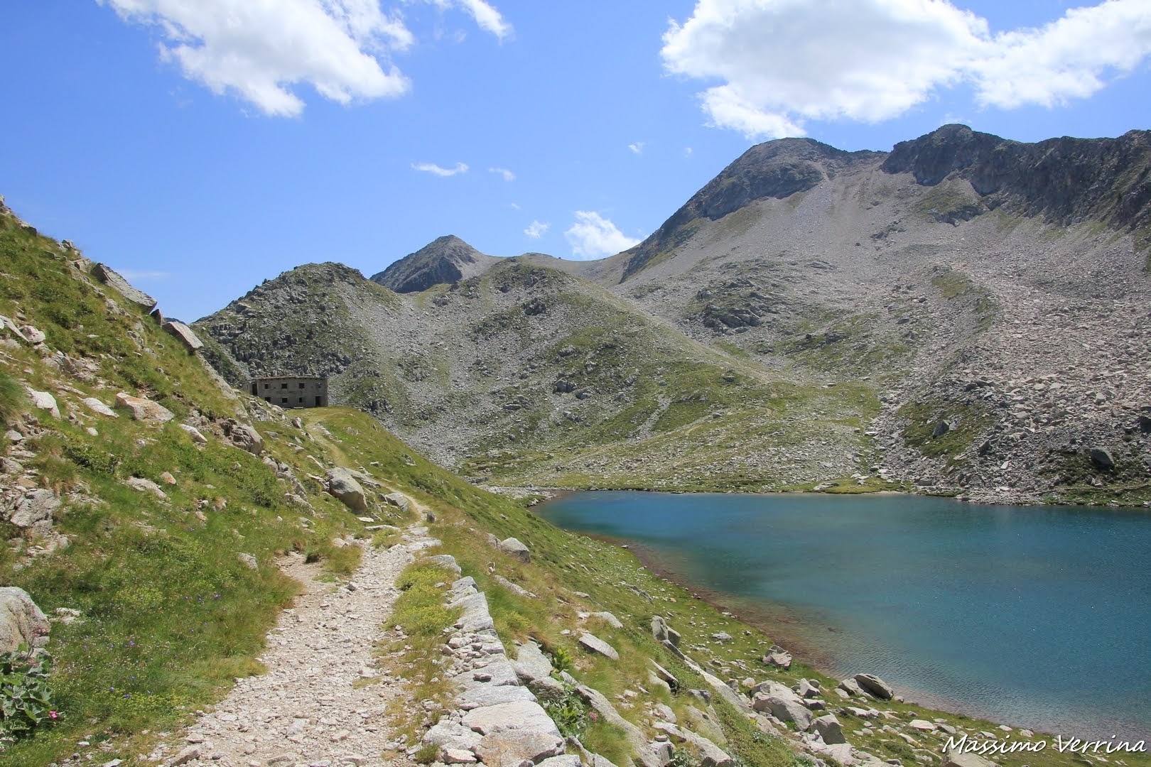 Questo terzo lago è in una bellissima conca, accarezzato dal vento fresco che scendeva dalla montagna con raffiche decise. Lo sto costeggiando seguendo sempre il tracciato della vecchia strada militare che ci porterà a scoprire il forte che vedete sullo sfondo…