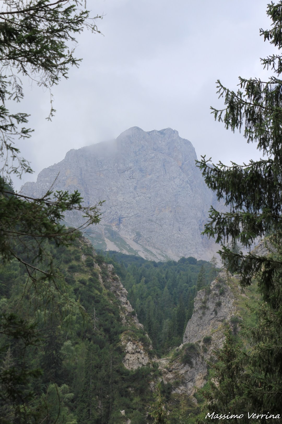 Cosa che ho fatto spesso durante quella salita. Così facendo si possono scorgere le ripide montagne che avvolgono la valle che stiamo risalendo. Qualche nube attorno ai monti dona quel fascino in più che non guasta mai in questo paesaggio alpino…
