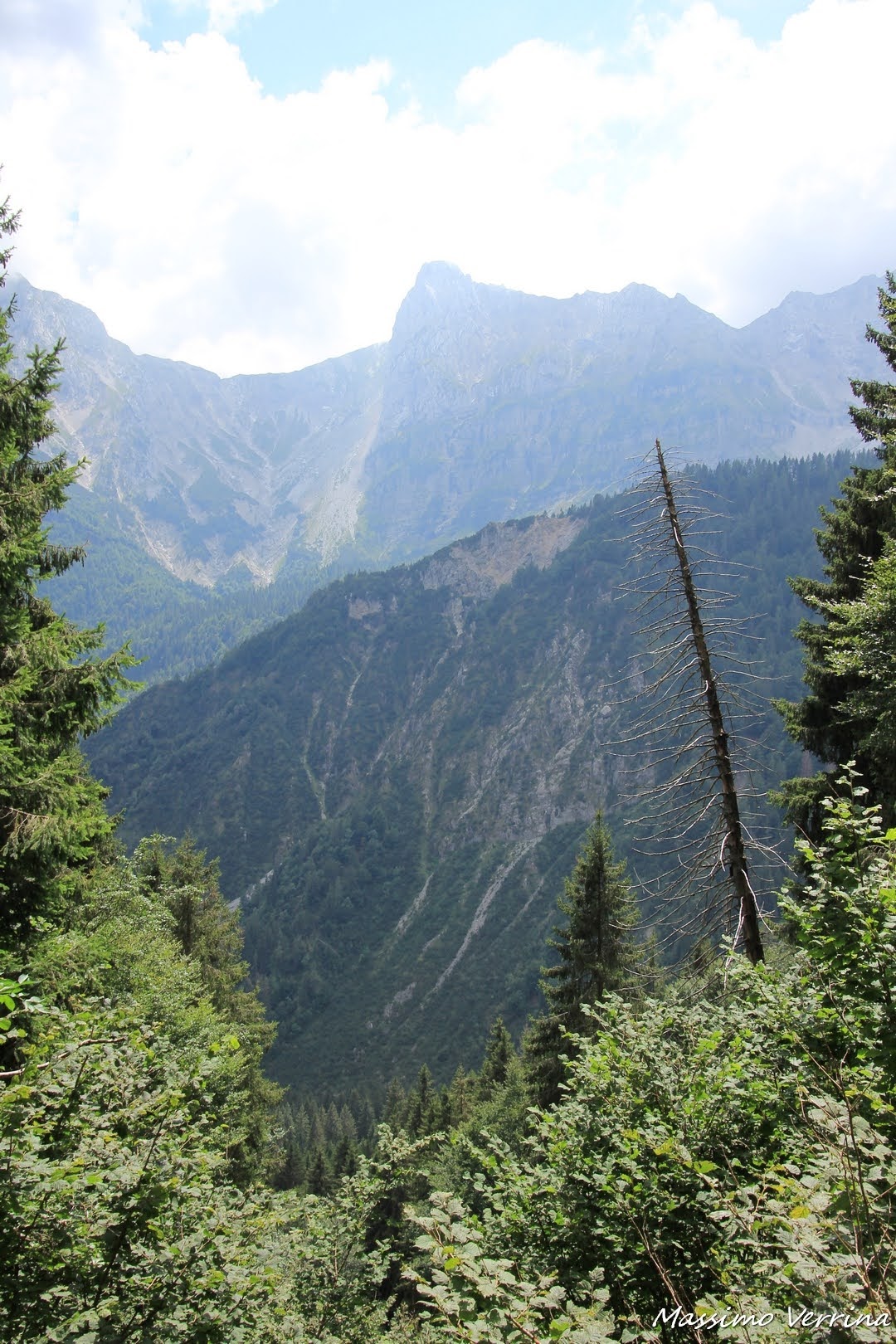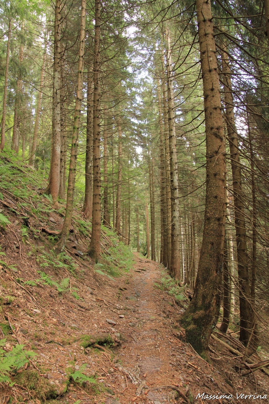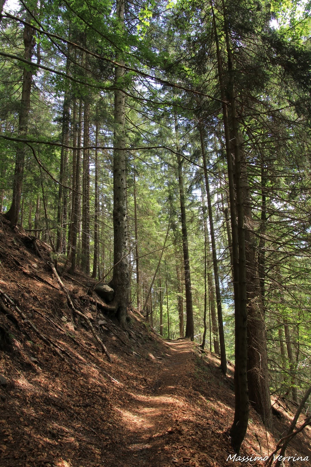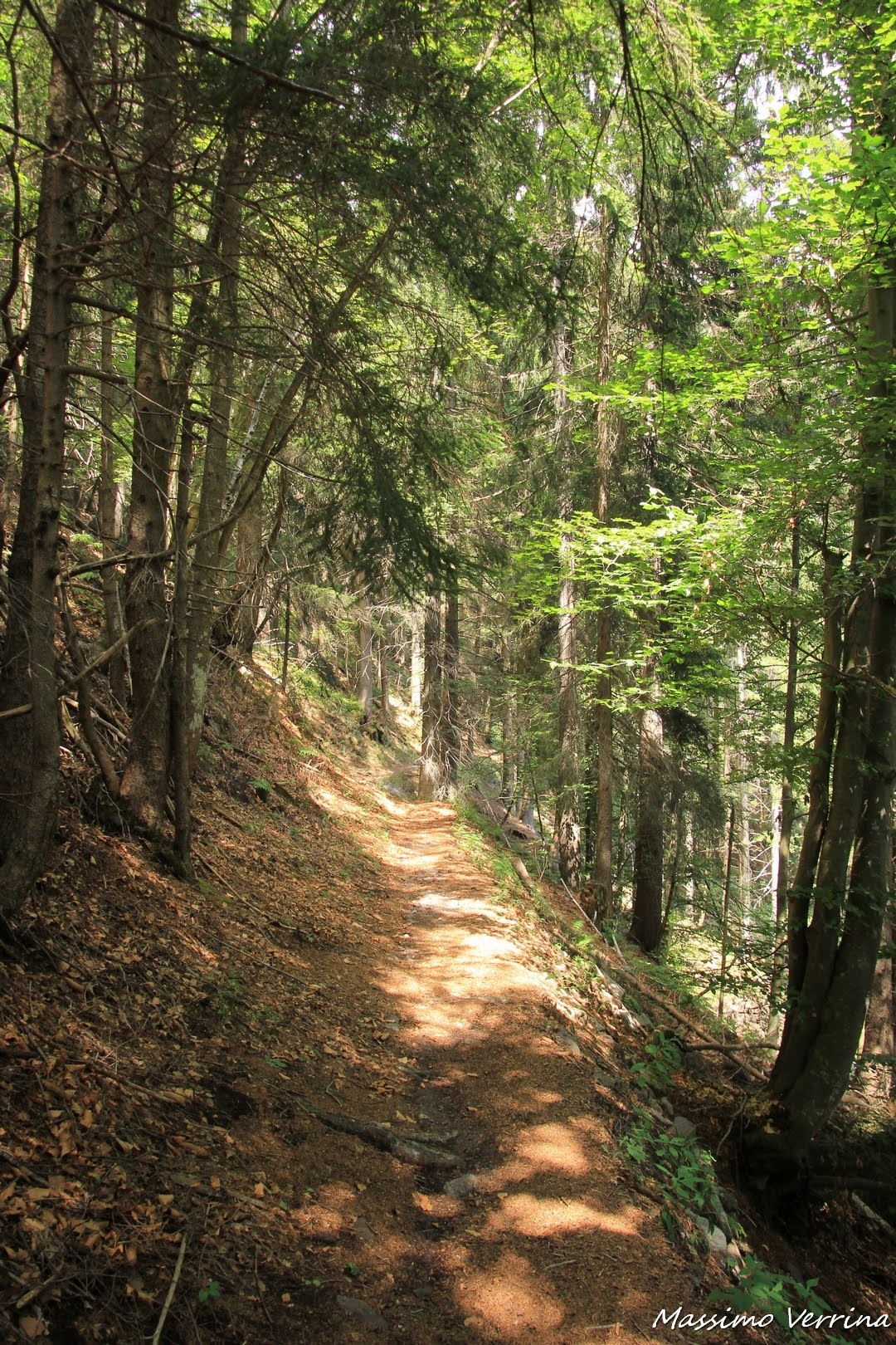 Questo tratto di sentiero cammina senza grandi dislivelli su un tratto alto sopra a Valcanale, il percorso è in prevalenza boscoso, solo in piccoli punti s’intravede il paesaggio dell’ampia vallata, dove lo sguardo può spaziare lontano, e dove ci si può fermare un attimo per ristorarsi l’anima…..