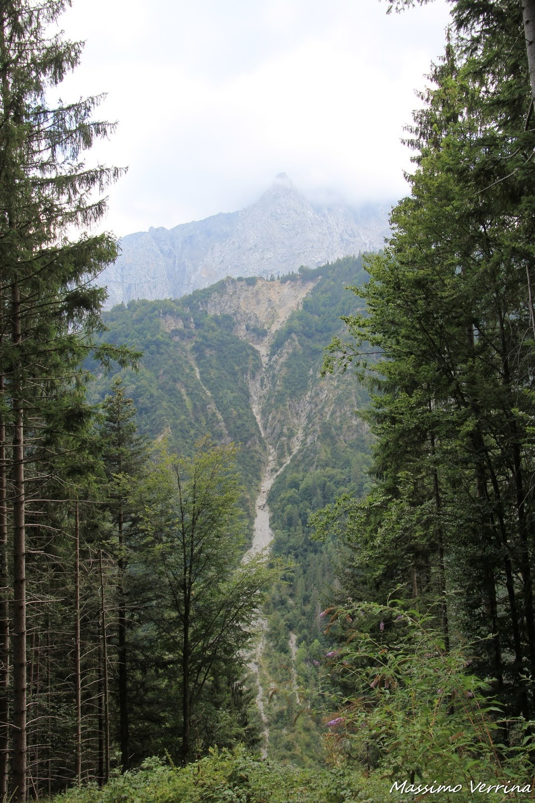 Il percorso nel bosco non presenta grandi spunti fotografici, ma alcuni punti li ho sottolineati, come ad esempio la prossima immagine, bella da un punto di vista strettamente fotografico. Come potete notare la punta del monte più alto davanti a noi sta proprio al vertice di un ideale canalone che scende con una linea verticale che taglia in due l’immagine. Una cornice scenica assai particolare che mette in risalto l’imponenza di quelle montagne….