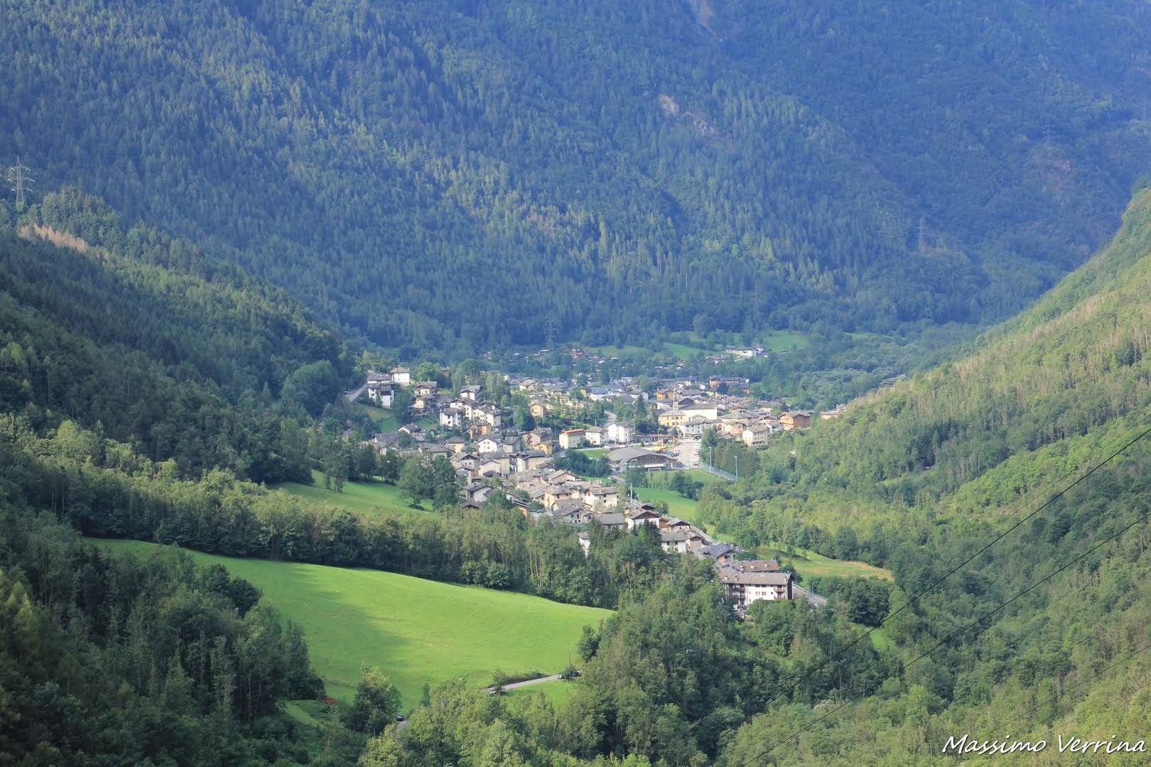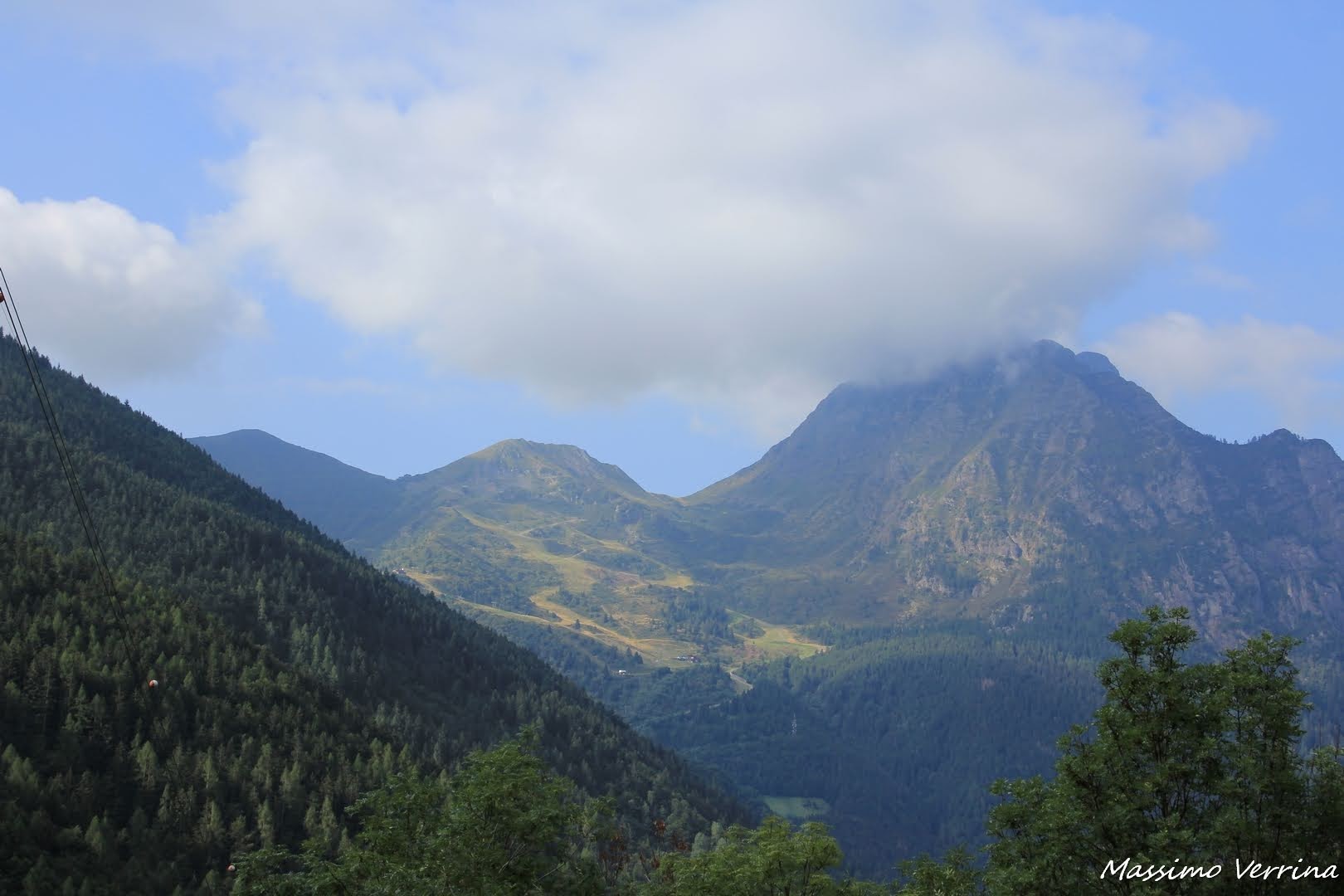 Dopo un primo tratto di durissima salita raggiungo un balcone panoramico dove mi fermo per una breve sosta e per ammirare il paesaggio della vallata. Ecco il borgo di Bondione dal quale ero partito solo mezz’ora prima. Per fortuna le nubi imponenti del mattino avevano lasciato spazio a delle ampie schiarite, ora il paesaggio era più solare…