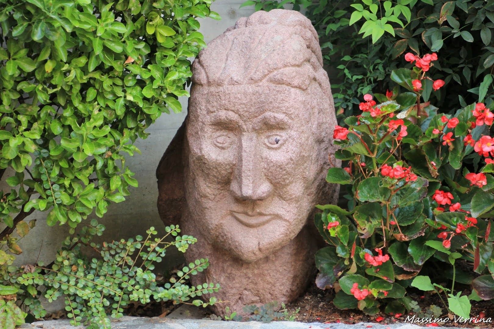 Una scultura troneggiava al centro di quella piccola aiuola, uno sguardo a tratti severo, reso vagamente inquietante da quel puntino nero che qualcuno ha posizionato su una delle pupille. Lo guardo mentre mi avvicino, attorno a me il silenzio dell’alba. Instauro un linguaggio muto con quella scultura avvolta nella natura, quasi a dimenticarmi della bellezza che ancora dovevo vedere…..
