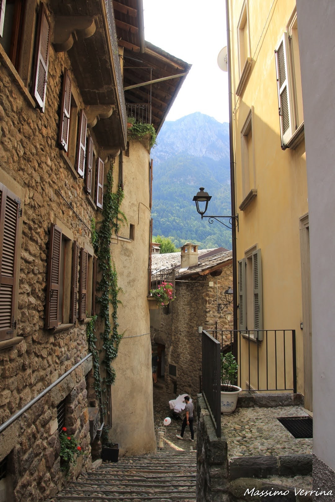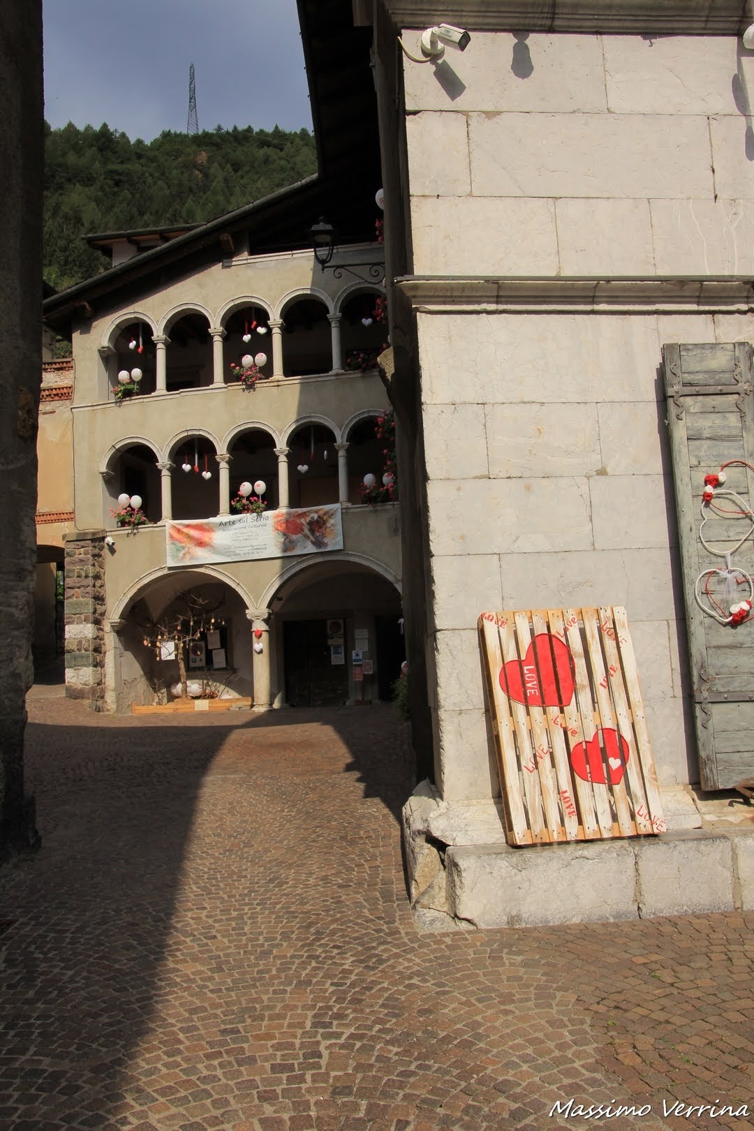 bellissimi i balconcini infiorati e con i palloncini..c ‘e’ una sensazione di festa che dona a quel palazzo! E tu ti lasci trasportare dai tuoi versi che sembrano far parte del borgo e sembrano anch essi in festa! In montagna, in ogni paese, spesso abbiamo degli scultori del legno che si dilettano e alcuni creano opere veramente pregevoli come ci hai mostrato in altre occasioni. Suggestivo il vicolo stretto che sfocia sulle montagne! Grazie Max per queste immagini festose e buona serata!
