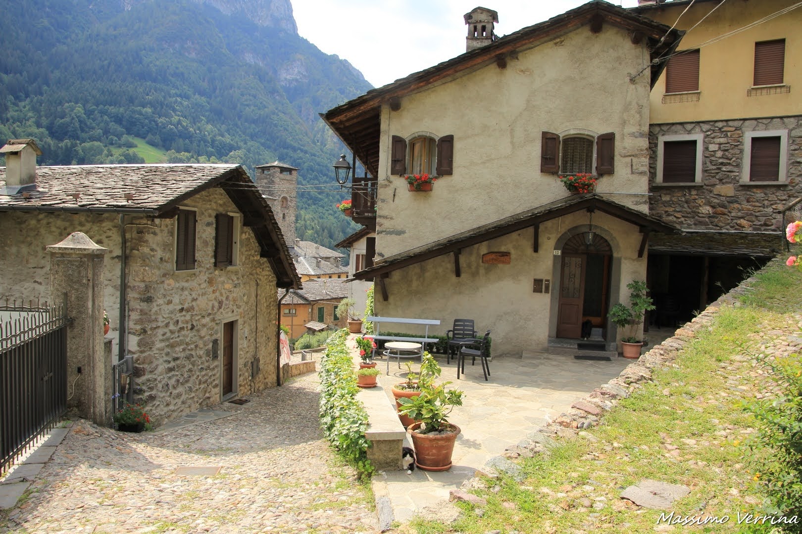 Strade acciottolate, balconi in legno, fiori sui poggioli, la pace assoluta di un borgo avvolto come un confetto nel cuore dei monti, una sillaba di luce posata fra gli occhi di un uomo senza età che ama narrarsi e narrare…..