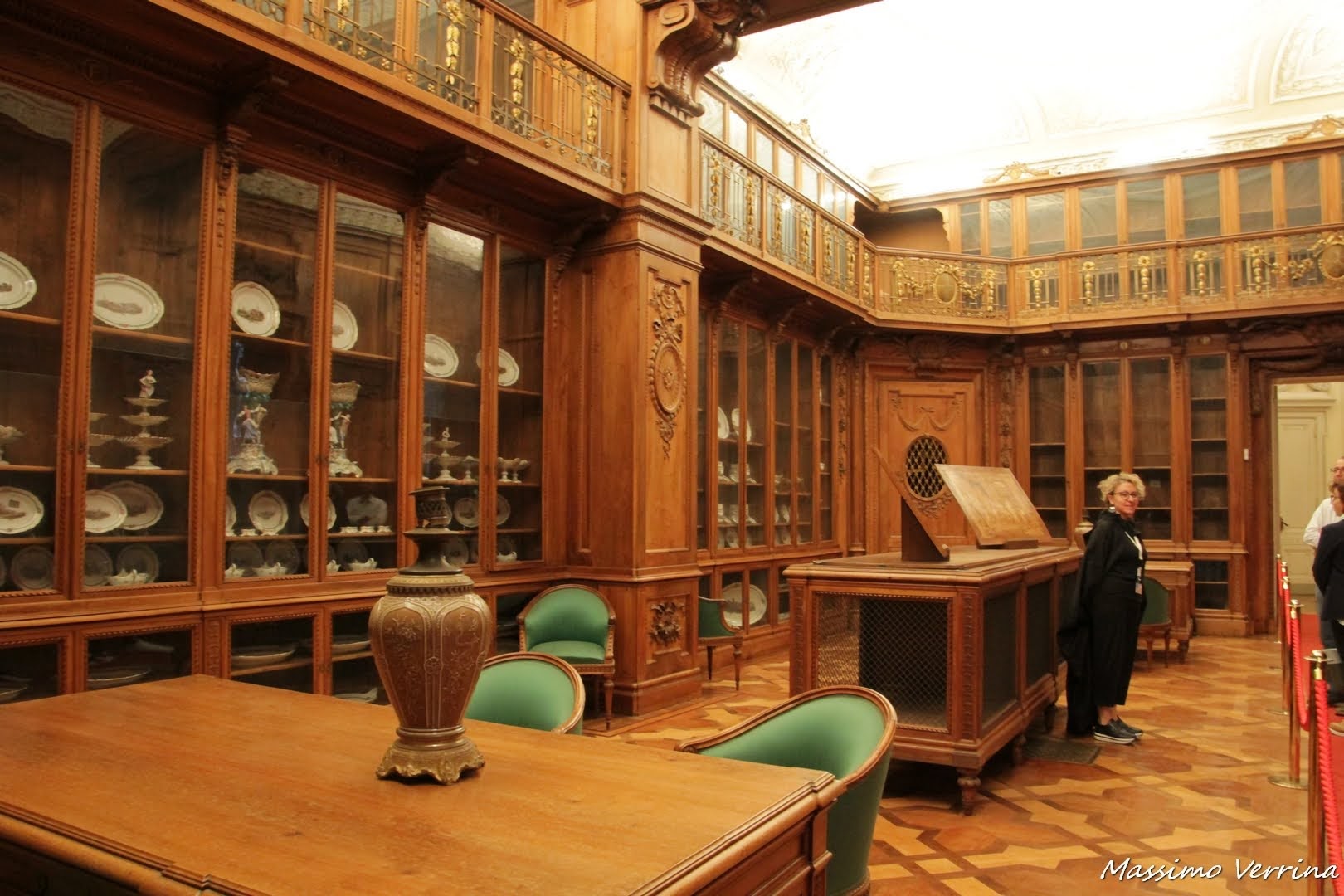 Entriamo ora in quella che era una grandissima libreria, al posto dei piatti che vedete esposti un tempo qua c’erano solo libri. Questa stanza era una delle poche del Palazzo dove potevano stare assieme uomini e donne, ovvero Re e Regina, infatti in quell’epoca storica ognuno aveva le sue stanze, non si viveva nelle stesse stanze, ma in ambienti separati, da lì è nata l’espressione “mi ritiro nelle mie stanze”….