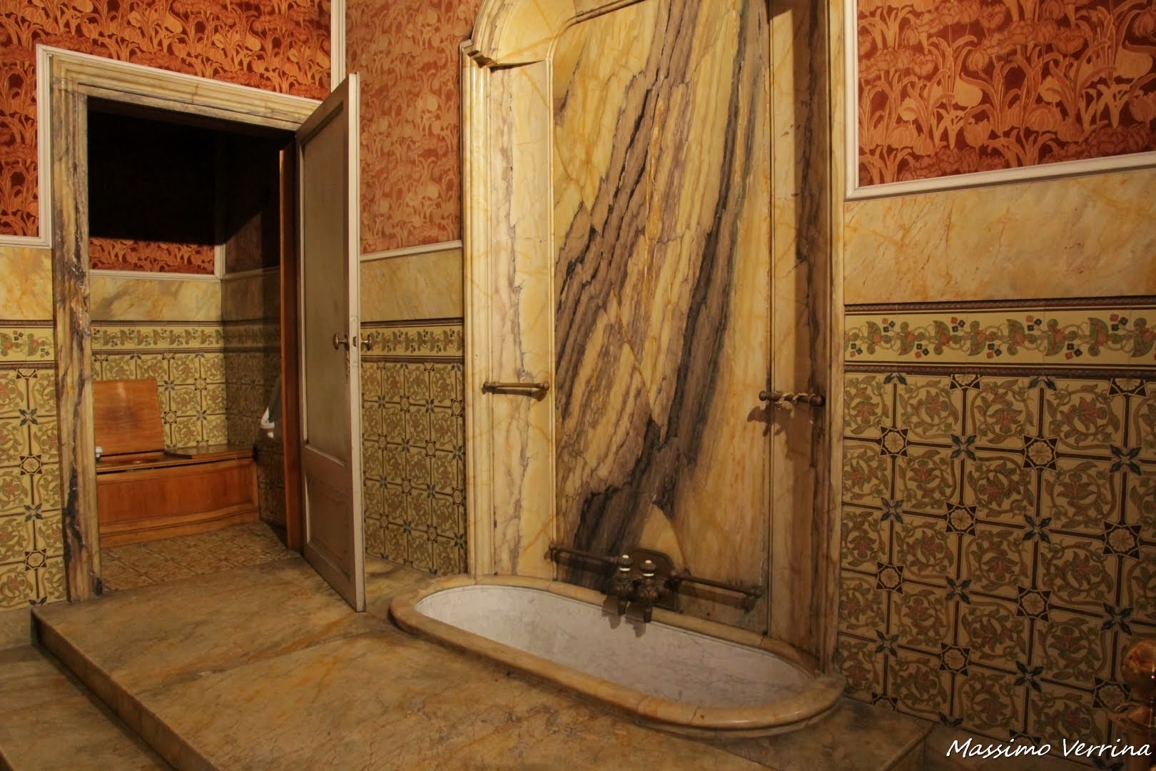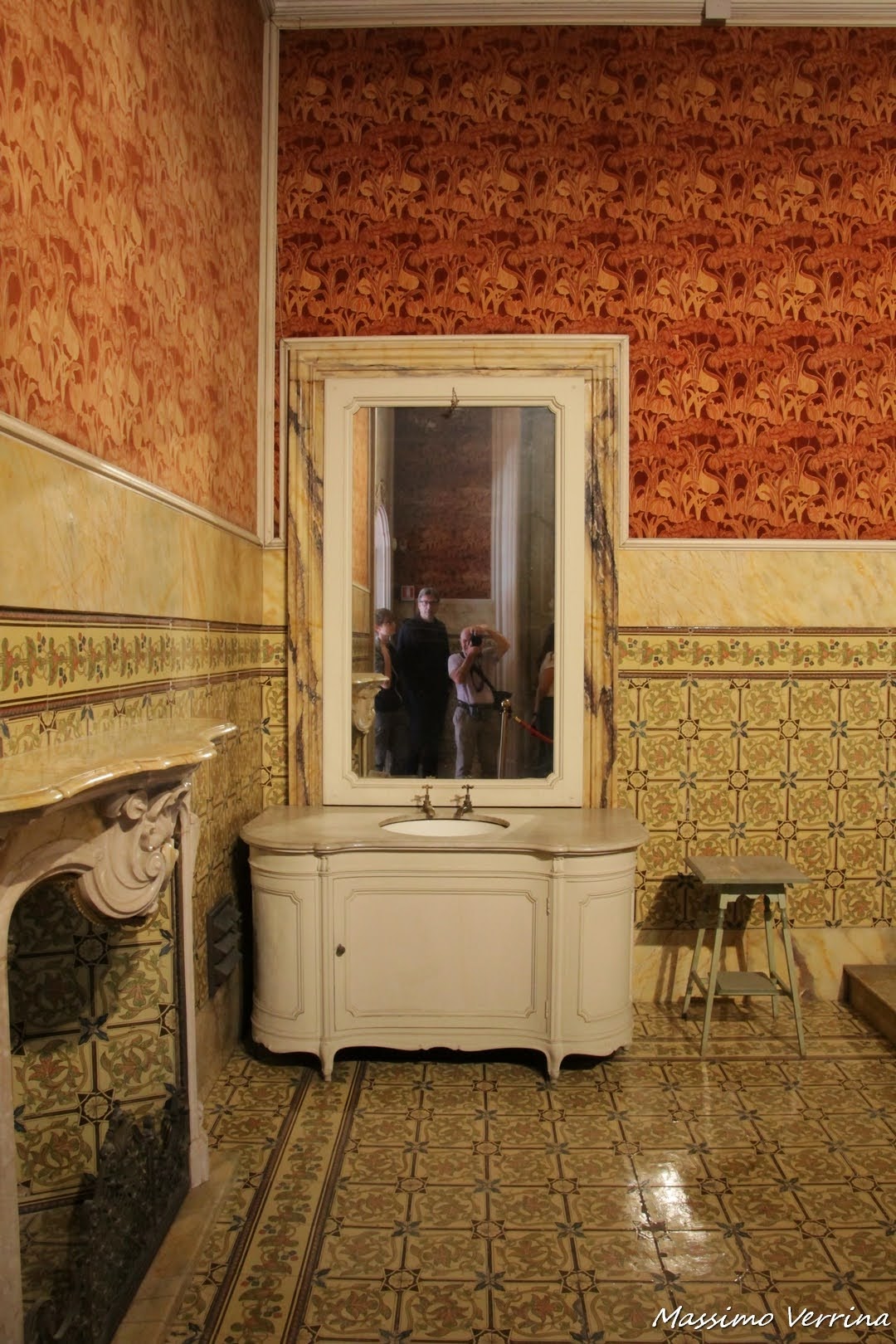 Non potevano ovviamente mancare gli specchi, e vi faccio notare una cosa, i rubinetti dell’acqua calda e fredda, fu una delle prime ville ad avere l’acqua calda, ma non solo, fu anche una delle prime ville ad avere l’energia elettrica, insomma era molto avanti per l’epoca, un vero punto di riferimento…