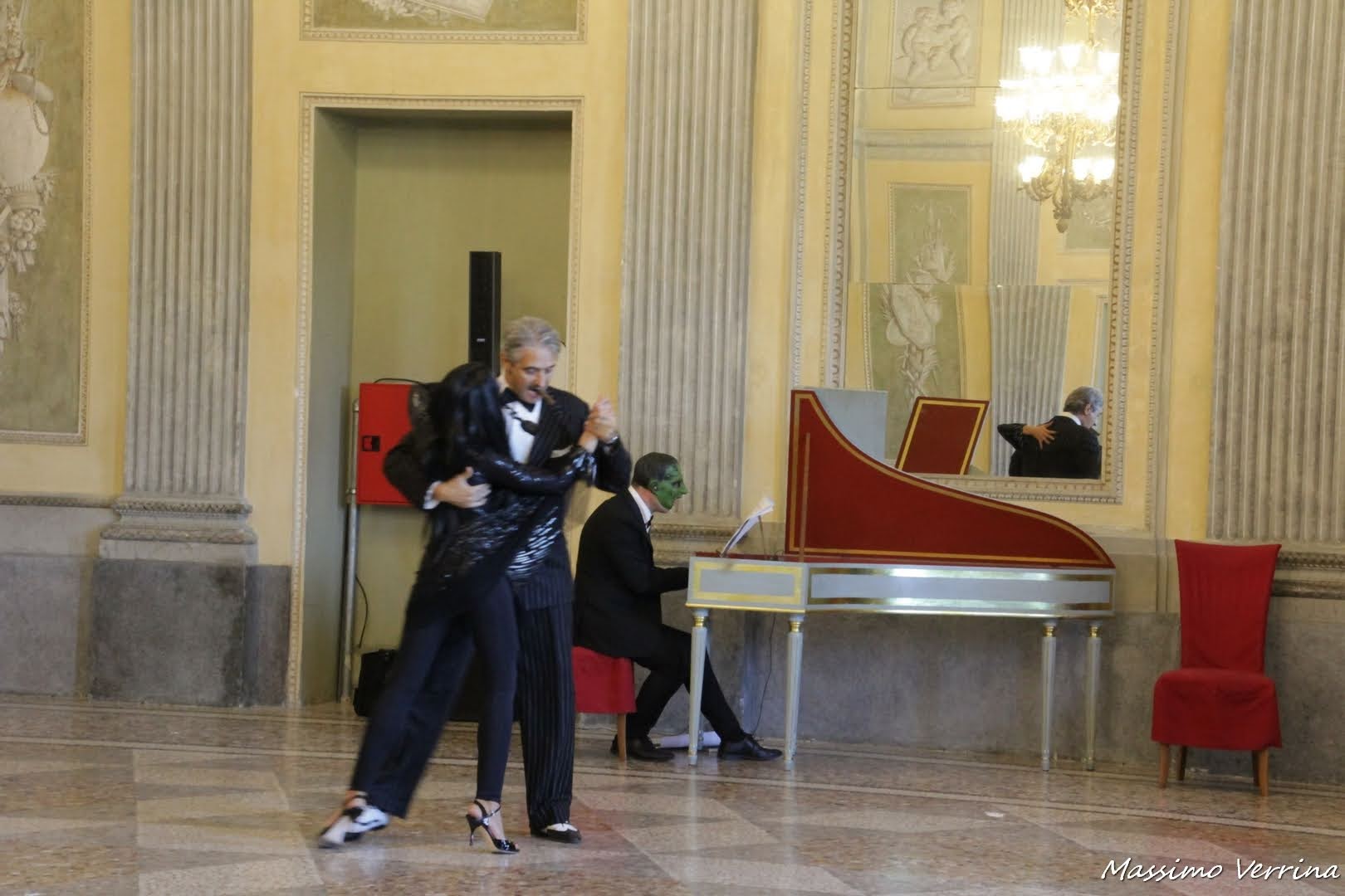 Ed ecco il pianista nella sua esibizione, di fronte ad uno degli specchi di questa maestosa sala, una delle più belle di questo immenso Palazzo, che sembra non finire mai tanto è grande ed esteso…