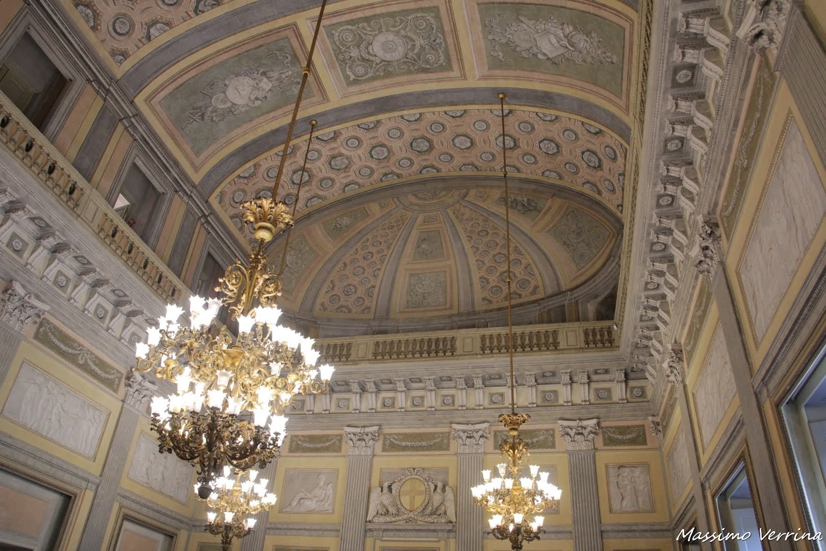 Vi faccio notare una particolarità di questo salone, ad un livello superiore c’era una vera balconata da dove potevano osservare i vari balli, e in molte occasioni qua era posizionata l’orchestra che sfruttava la risonanza del soffitto per creare un vero concerto per coloro che ballavano in questa vastissima sala da ballo, come vedete qua nulla era lasciato al caso…