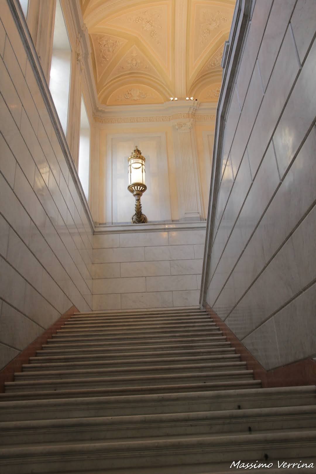 Già la scala merita di essere ammirata per la bellezza dei suoi pavimenti, per le luci simmetriche e per la scenografia che preannuncia l’arrivo al piano superiore di questa immensa Reggia..
