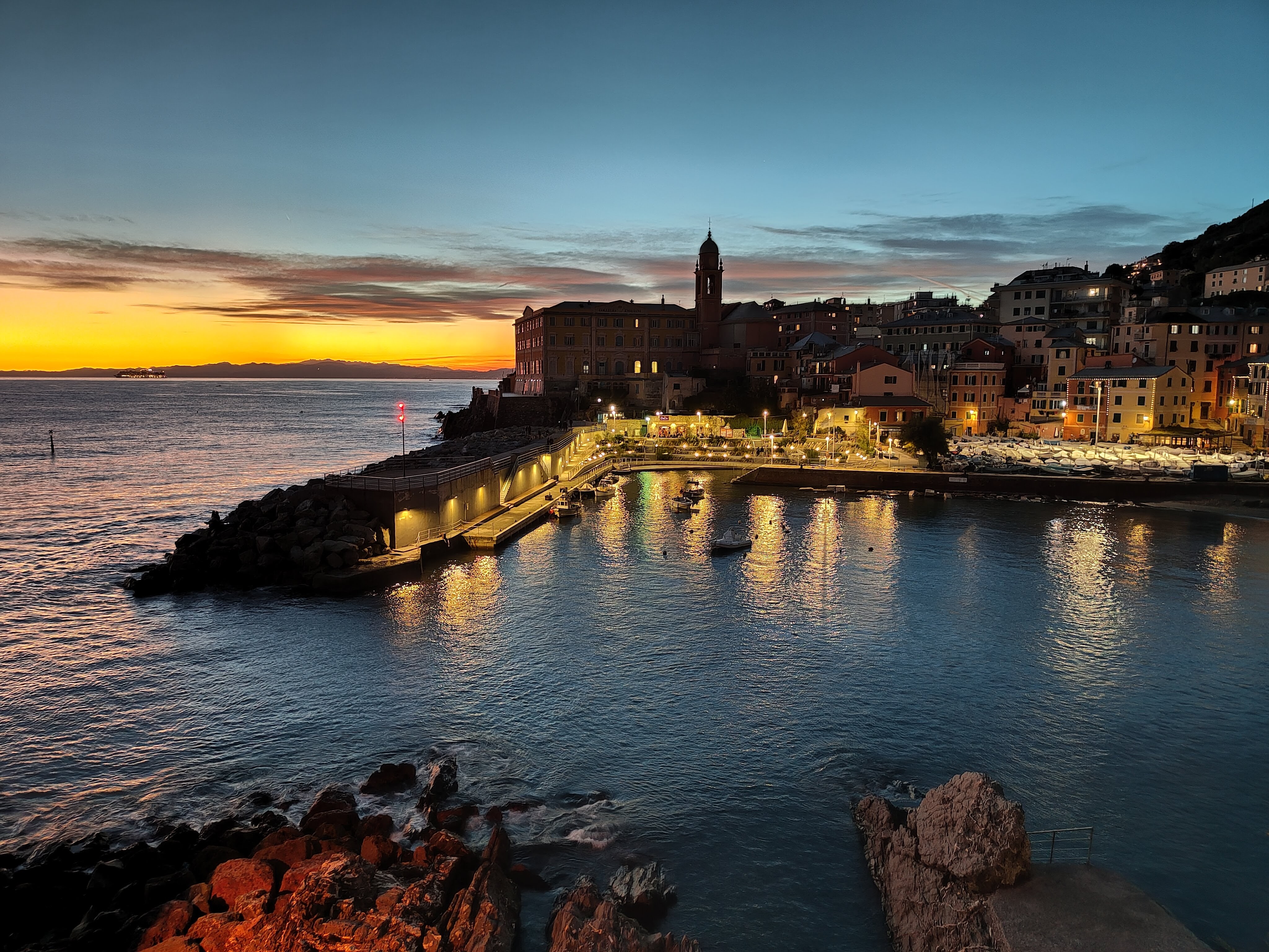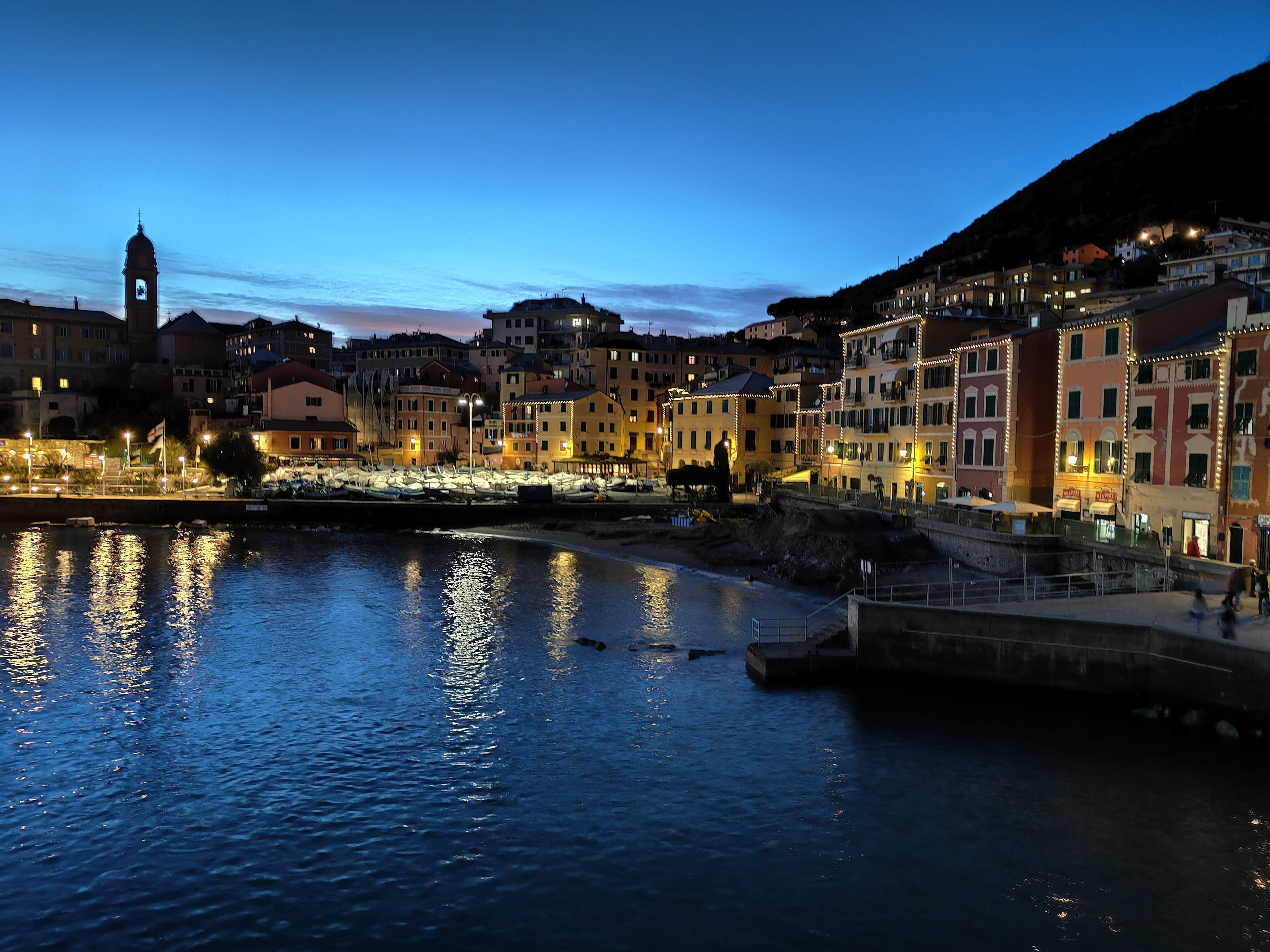 Ma finiamo di guardare l’ora blu, attraverso gli ultimi due scatti meravigliosi che ho deciso di farvi ammirare, ecco il porticciolo di Nervi nella sua completezza, con le ultime luci del tramonto sullo sfondo e le luci artificiali che illuminano la parte nuova del porticciolo, rifatta negli ultimi anni. Un colpo d’occhio a mio avviso incantevole!! …