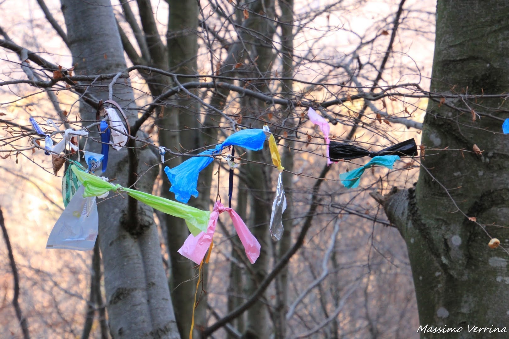 La mia voglia di scoprire colori questa volta è stata catturata da questi colorati frammenti di plastica, posizionati come bandierine svolazzanti al vento, proprio in corrispondenza di uno dei tanti alberi dove fermarsi a meditare e respirare i particolari influssi degli alberi…