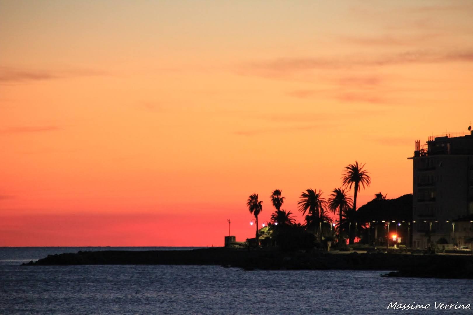 Col teleobiettivo osservo la parte finale della passeggiata, le palme muovono al vento, il mare è una sfumatura di freddo avvolta nella carezza dell’inverno, e quelle luci, così sature, così vive, un urlo di luce che saluta gli ultimi istanti del giorno…