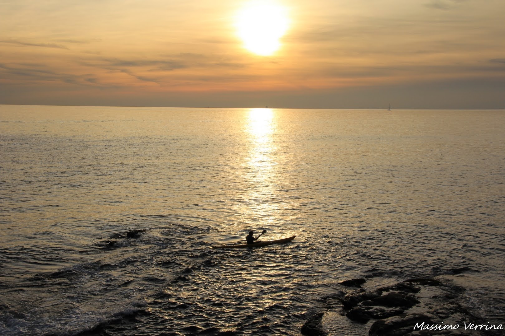 La pace che accompagna un tramonto sul mare, così ho voluto raccontare questi momenti, ho atteso che una canoa attraversasse il raggio di sole per costruire un’immagine che avesse davvero il sapore della poesia, quella della Liguria, la mia terra natale….