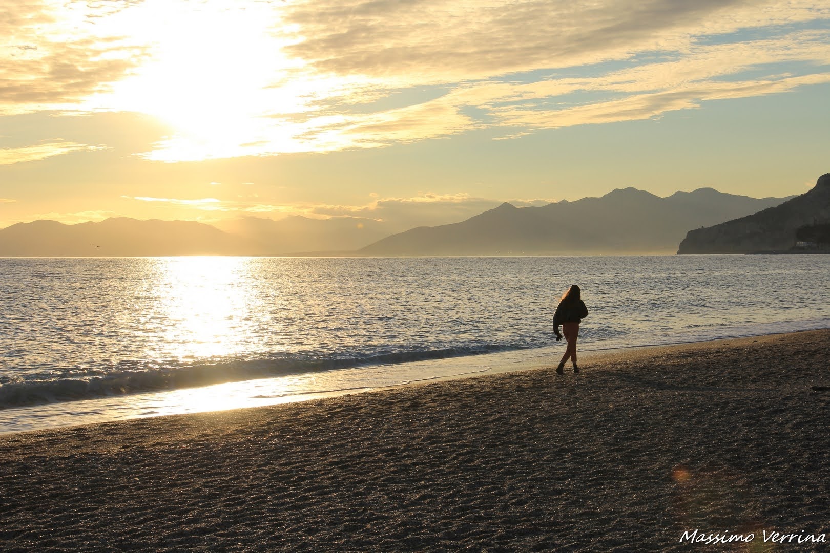 Una ragazza cammina nelle luci del tramonto, il suo profumo si fonde con quello della salsedine in un concerto di emozioni che mi avvolge mentre decanto poesie fra le braci della sera…..