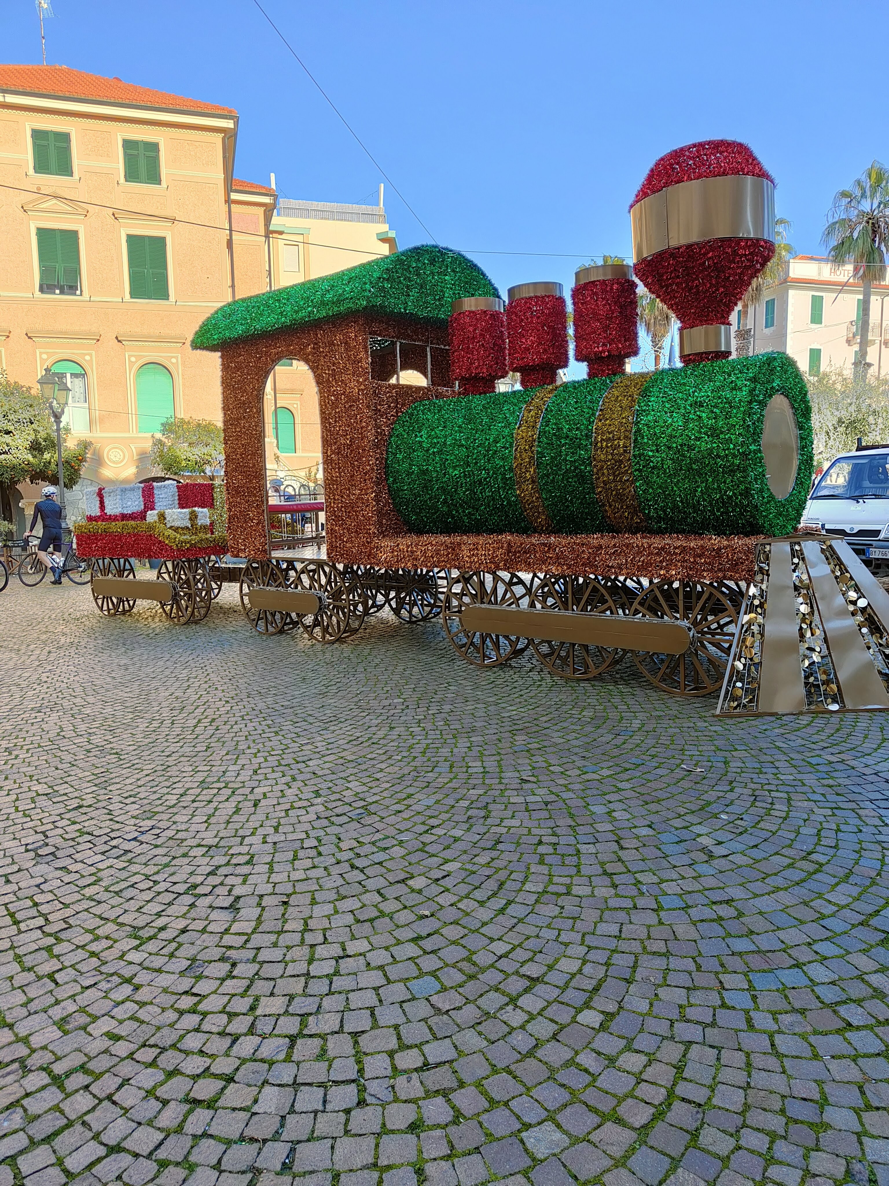 Nelle festività natalizie anche qua non mancavano le decorazioni e le cose curiose, come questa locomotiva che trasportava regali per le vie del paese, un colorato affresco che metteva gioia ai bambini e non solo…