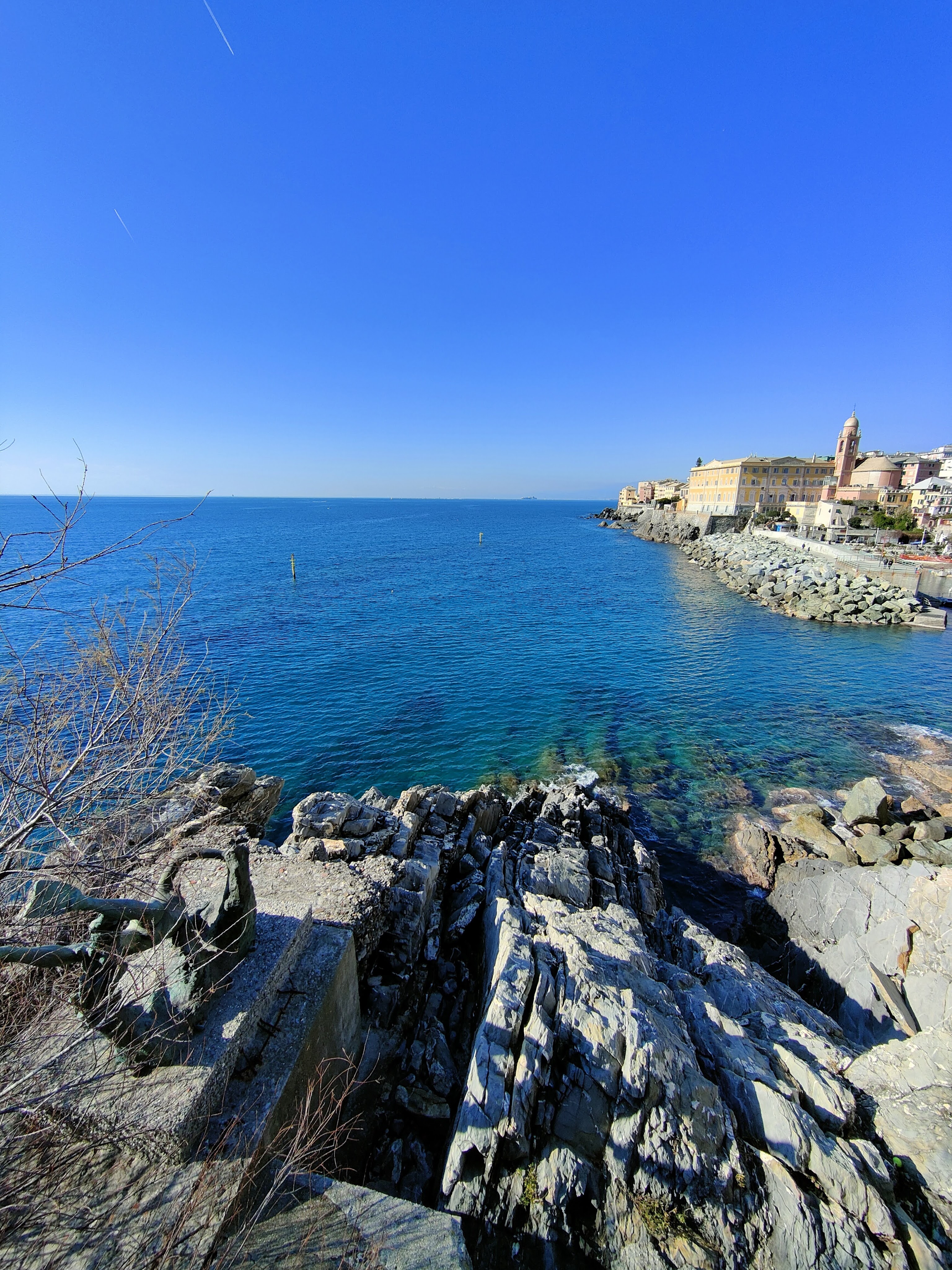 Utilizzo la modalità grandangolo per cogliere altri aspetti di questo territorio, come il monumento dedicati ai sub che è posto subito sotto quel tratto di passeggiata, proprio davanti ad uno dei punti più fotografati di Nervi…