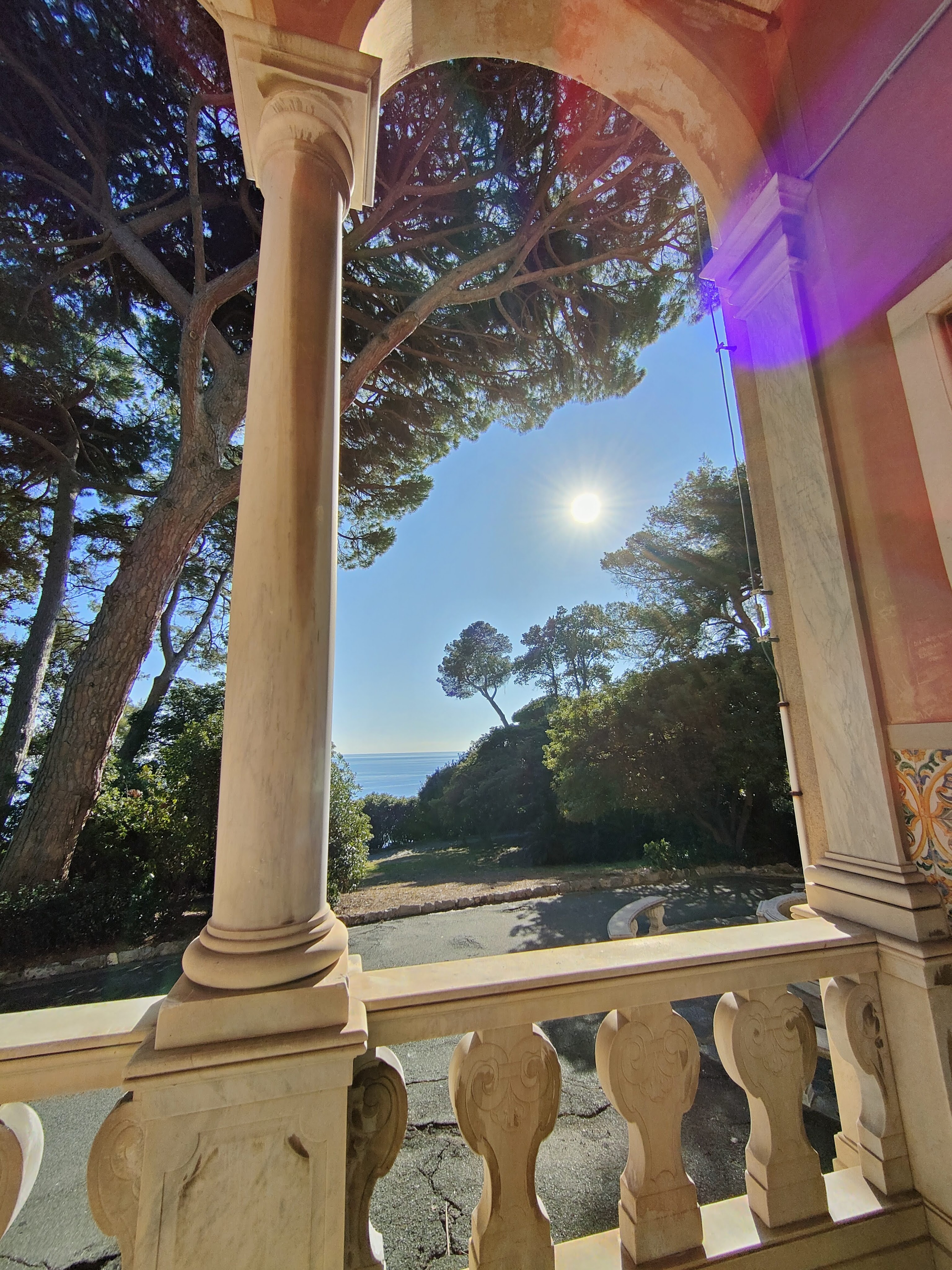 Prima di lasciare questa Villa cerco uno scatto assai singolare e lo trovo sul piccolo balconcino della Villa stessa. Qua i raggi del sole entrano fra la cornice delle colonne offrendoci uno spaccato di pura bellezza….