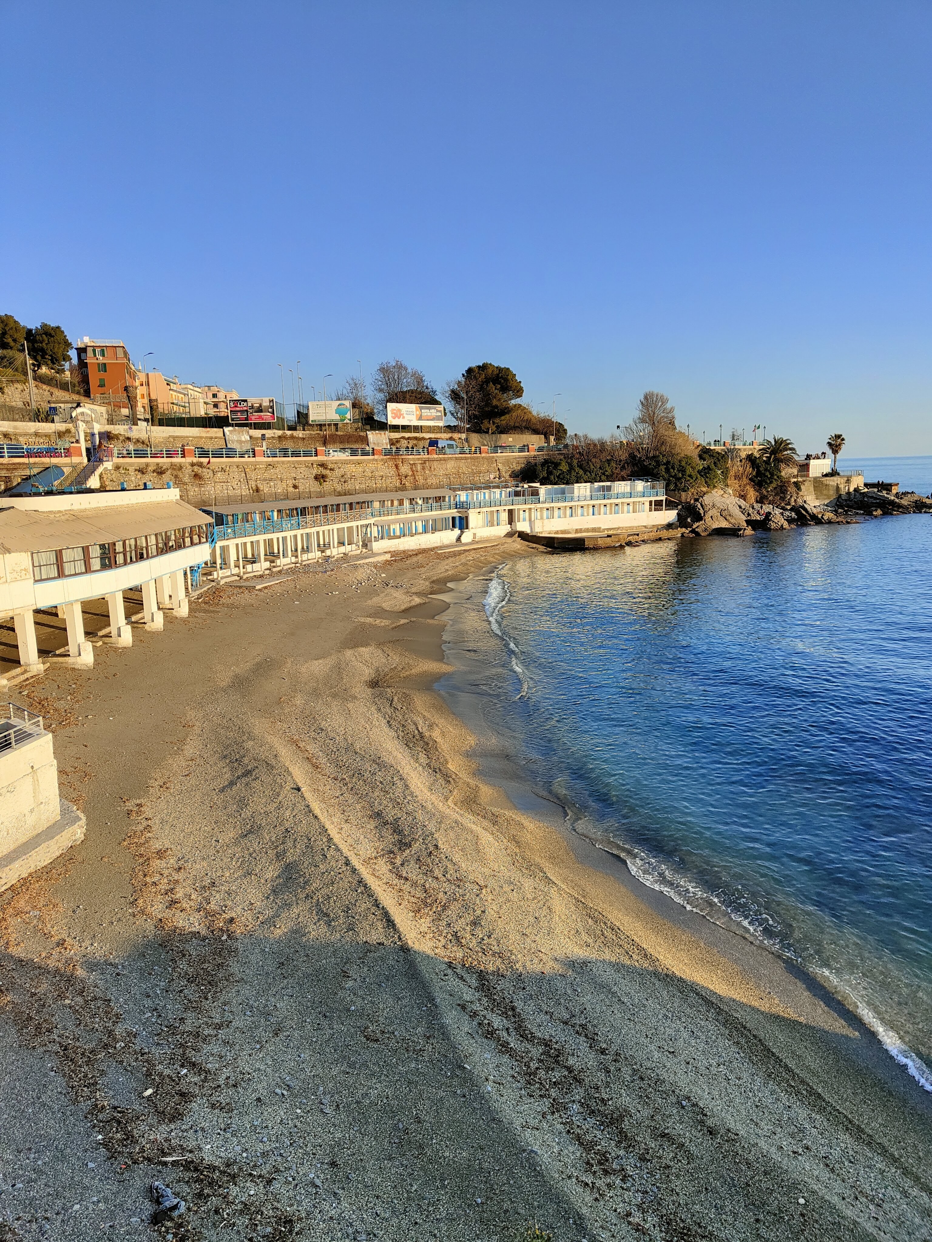 Nel pomeriggio la folla in giro era aumentata, anche le spiagge di Quinto si erano riempite di gente pronta a catturare i raggi del sole in questa mite domenica di febbraio, io ero di ritorno dal mio lungo cammino iniziato la mattina. Le luci stavano mutando, ai colori accesi e vivi del giorno si andavano mischiando le tinte ocra del vicino tramonto….
