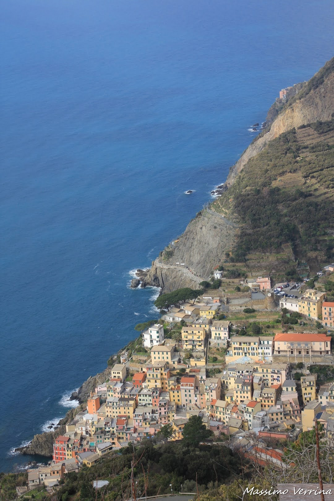 Sotto di noi ecco Riomaggiore, il borgo dal quale siamo partiti, qua lo vediamo da una prospettiva aerea da cui possiamo apprezzarne la sua struttura addossata alla montagna, quasi a divenirne una sua estensione…