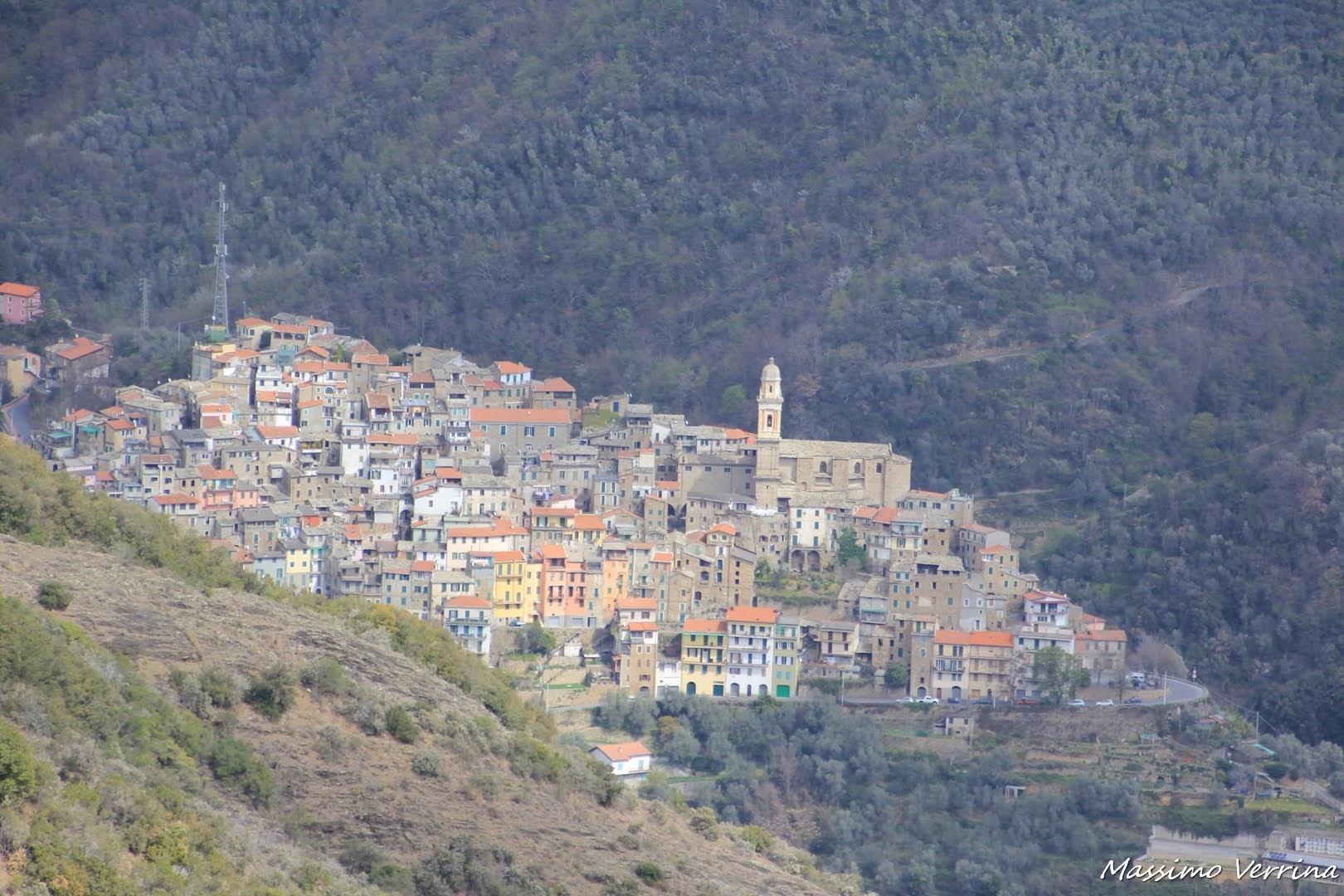 Passata una curva, dal cuore del bosco, ecco rispuntare l’abitato di Montalto ligure. Sembra cullarsi in mezzo ai monti, visto da qui assume un aspetto ancor più bello e selvaggio….
