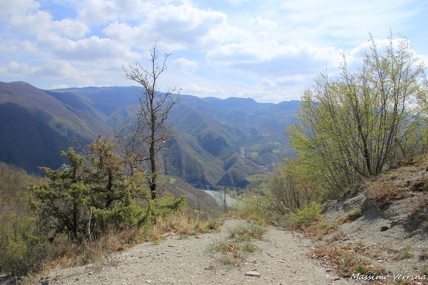 La lunga discesa permette di riprendere fiato dopo la lunga salita dell’andata, qui il sentiero alterna tratti di sterrato a percorsi nel bosco, in lontananza si vede già spuntare il fiume Trebbia che sarà il protagonista del proseguo del cammino..