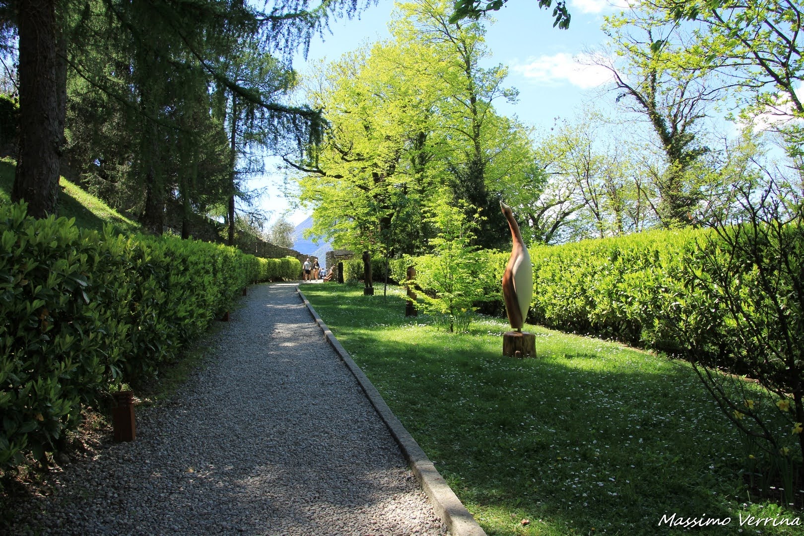 All’interno di alcune gabbie subito sotto al Castello si possono ammirare alcuni esemplari di gufi, la rete metallica non permette di vederli al meglio, ma ho cercato di togliere più imperfezioni possibili all’immagine per restituirne la sua purezza. Proseguiamo nel vialetto che precede l’ingresso al Castello vero e proprio, qua troviamo delle sculture che ci mostrano dei Lariosaurus, rettili appartenenti al Triassico medio che presentavano un collo allungato ed erano lunghi circa un metro…