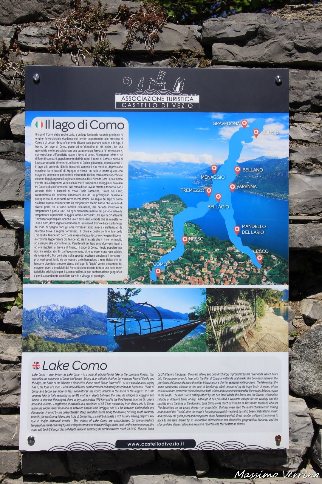 Un cartello turistico posto all’ingresso del Castello illustra il Lago di Como, con tutte le curiosità e le informazioni ad esso collegate. Se v’interessa approfondire potete allargare l’immagine sotto e leggerne il testo….