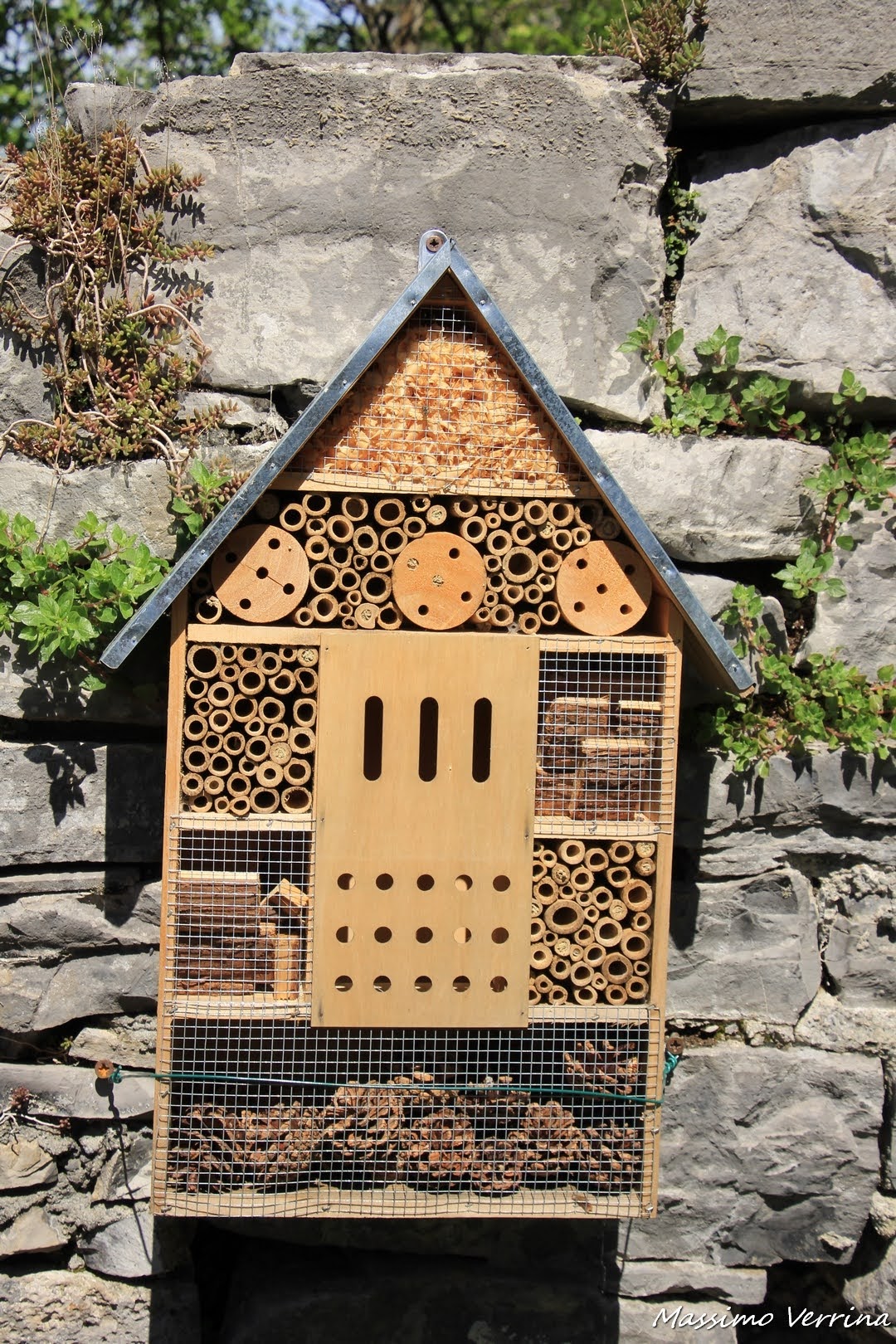 La casetta è un “insects hotel”, cioe un ricovero per insetti che vi possono passare la notte o l’inverno. Una volta entrati nei tubicini di legno, sigillano l’entrata.