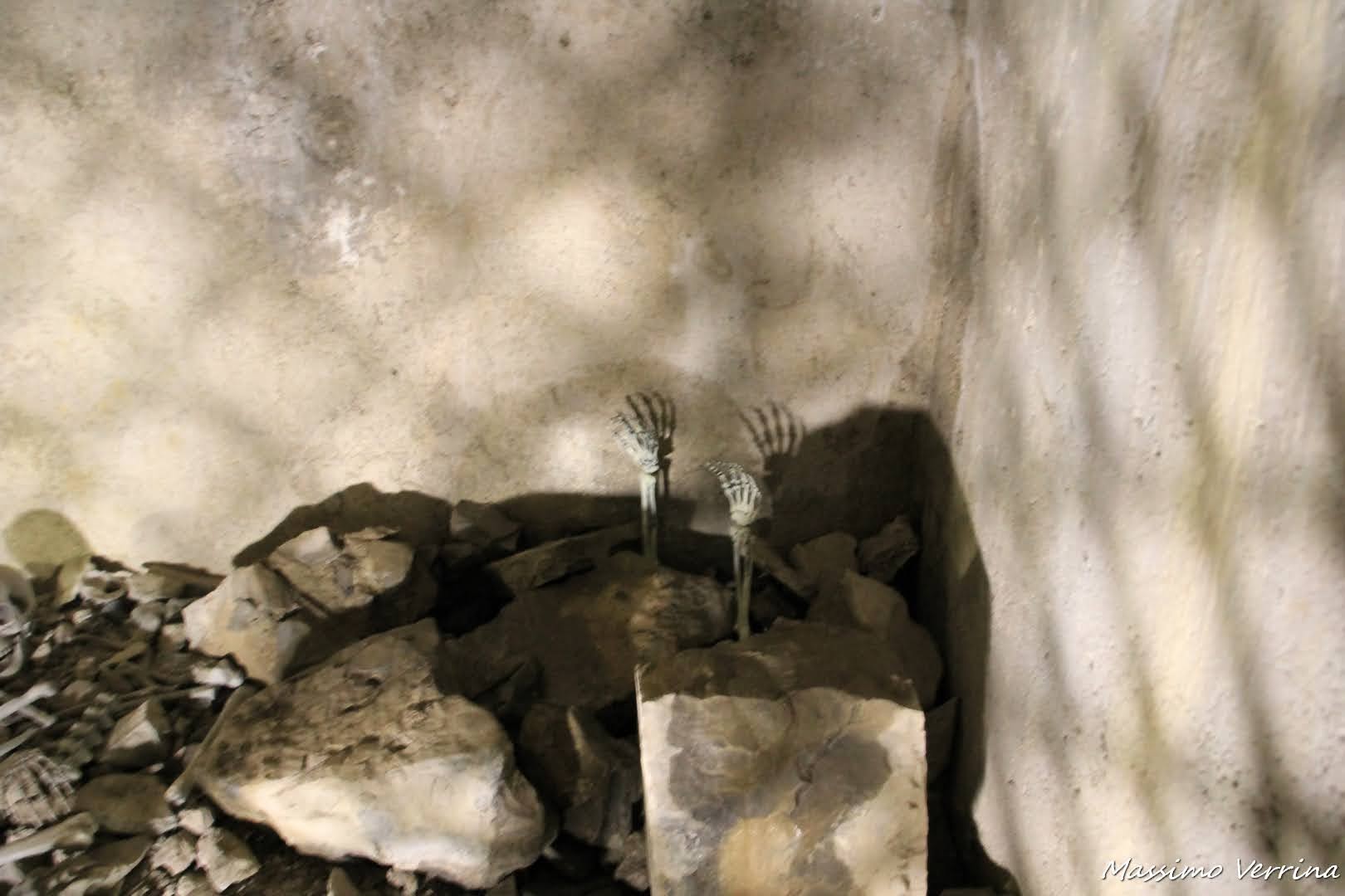 Ci sono anche due mani di scheletro che sembrano uscire da una tomba, non si sono fatti mancare proprio nulla in questa particolare ambientazione, come nei migliori set dei film horror…