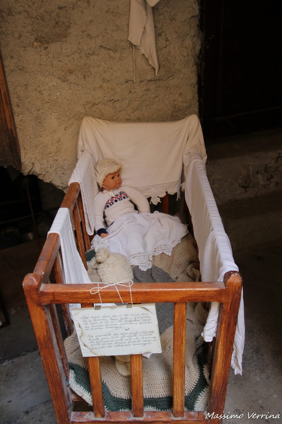 Nella puntata di ieri avete visto la culla da distante, voglio farvela vedere da vicino assieme a tutti i bellissimi oggetti che avete visto con l’immagine di apertura di oggi. Vorrei farvi notare i bellissimi lavori fatti a mano, ma non solo, sulla facciata della culla c’è un cartello scritto in dialetto e in italiano, per far ricordare l’importanza oltre che di tutto ciò che riguarda il passato, anche delle lingue. In Italia molti dialetti locali vanno scomparendo, i giovani ormai parlano in prevalenza in italiano, solo alcuni Comuni italiani conservano e tramandano ancora le vecchie lingue di un tempo, questo succede soprattutto nelle vallate alpine di confine, dove sono molti i borghi in cui si parlano contemporaneamente diverse lingue….