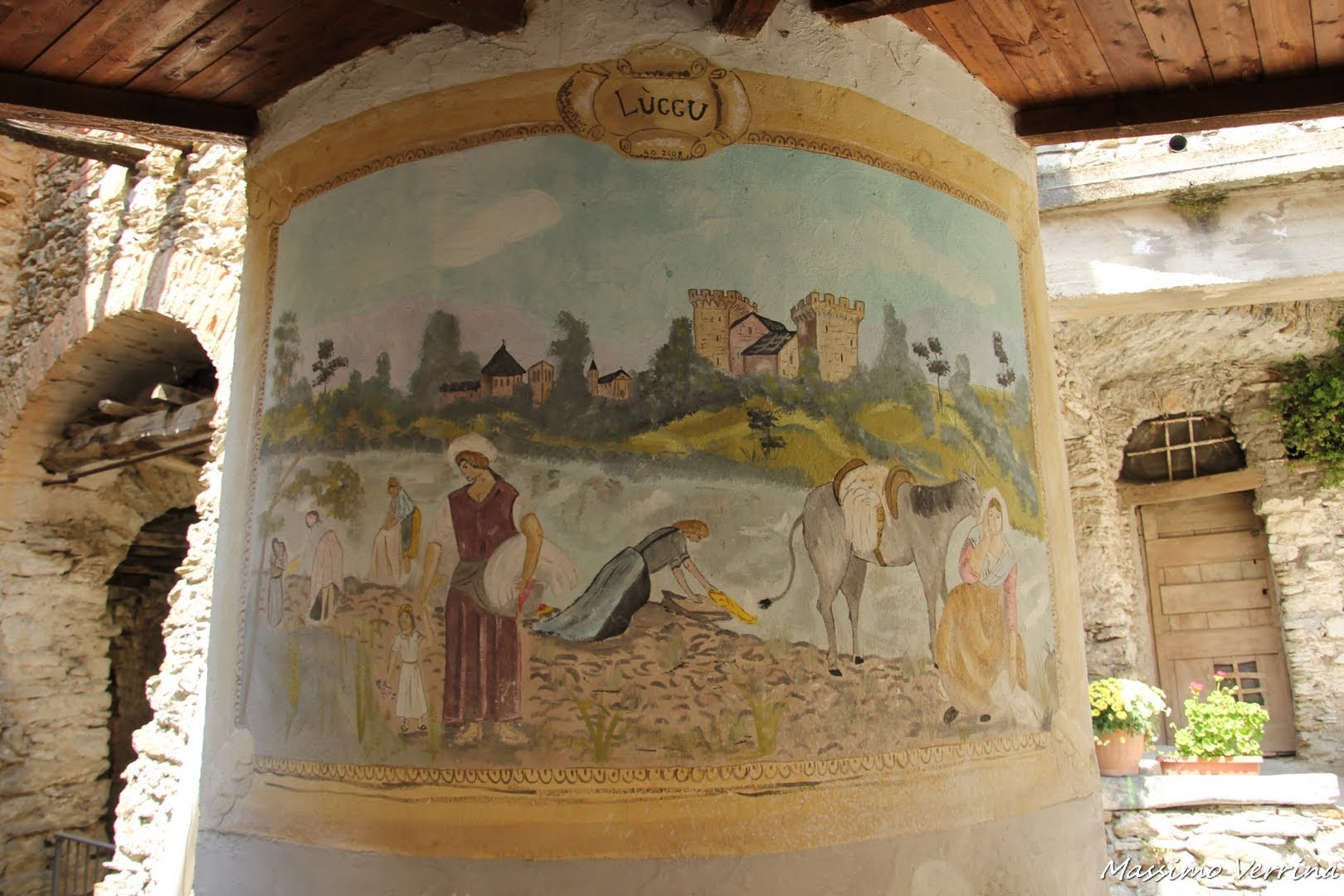 Siamo arrivati in un punto molto particolare del borgo, qua sopra ad un lavatoio circolare ci sono dei bellissimi affreschi che riproducono uno spaccato della vita di un tempo, un’immersione nell’arte e nella storia a 360°…