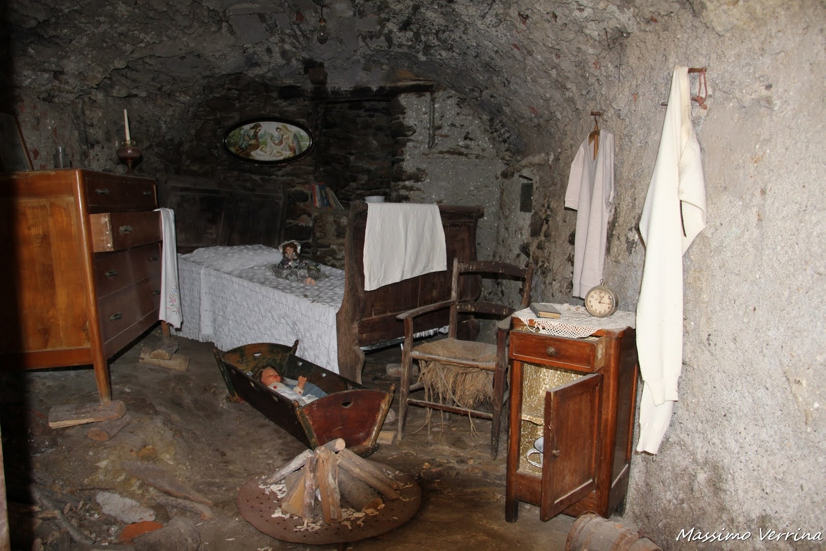 Poco distante in una cantina che assomiglia ad una grotta ecco la ricostruzione di un’antica camera da letto, un tempo non c’era il riscaldamento, qui hanno riprodotto della legna, che nelle giornate più fredde poteva servire per scaldare i piccoli ambienti. Qui tutto era minimale, semplice, spartano, si viveva alla giornata, senza alcuna comodità ….