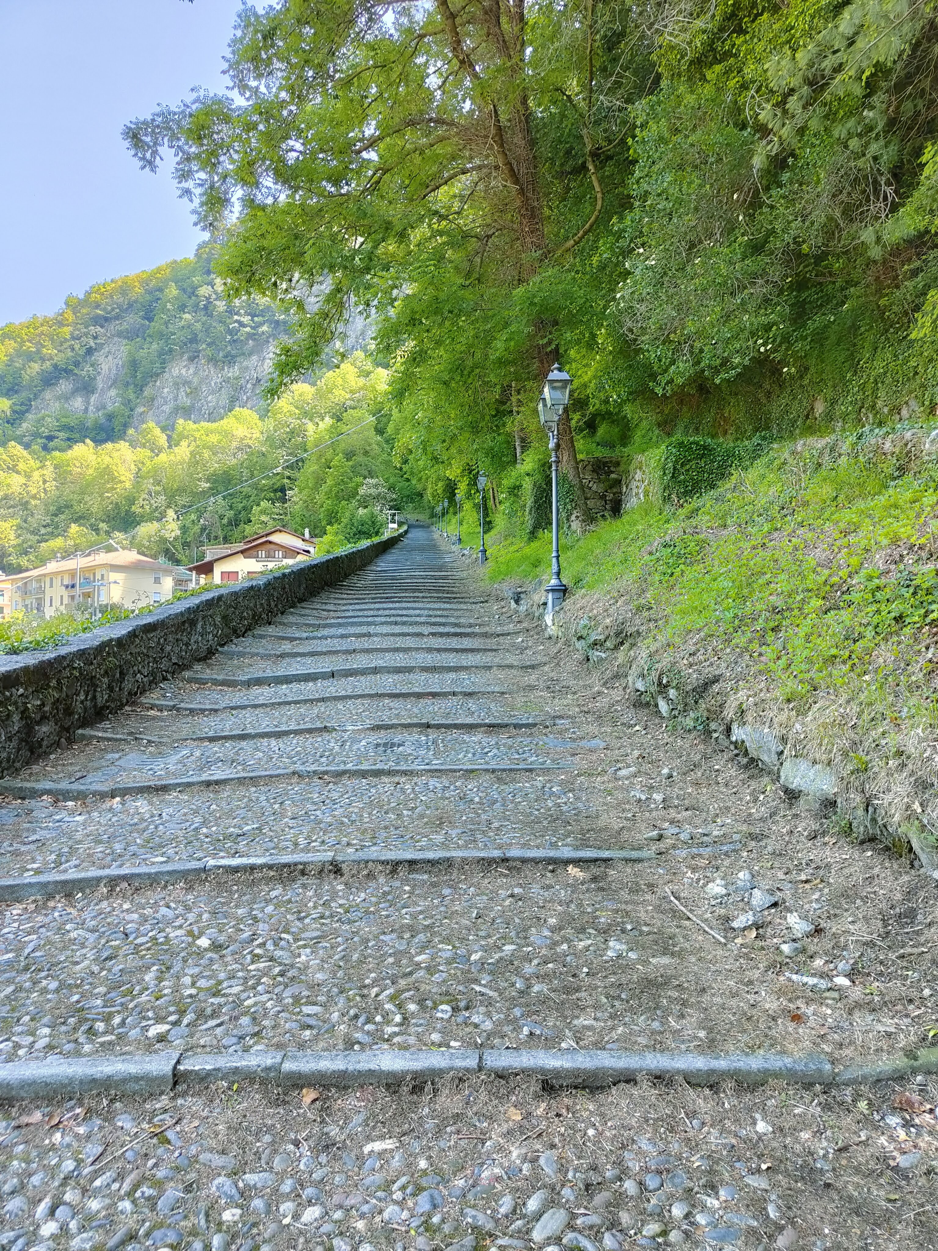 La lunga salita ci appare come una via Crucis con alcune stazioni nel corso della salita, e un grande verde che ci avvolge riparandoci in qualche modo dal gran caldo dovuto al cammino….