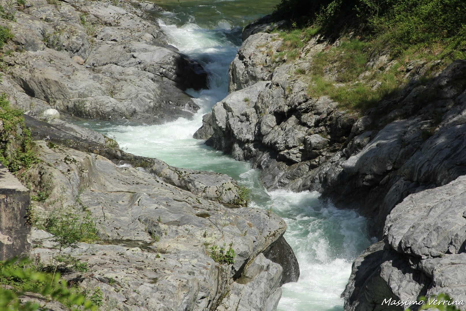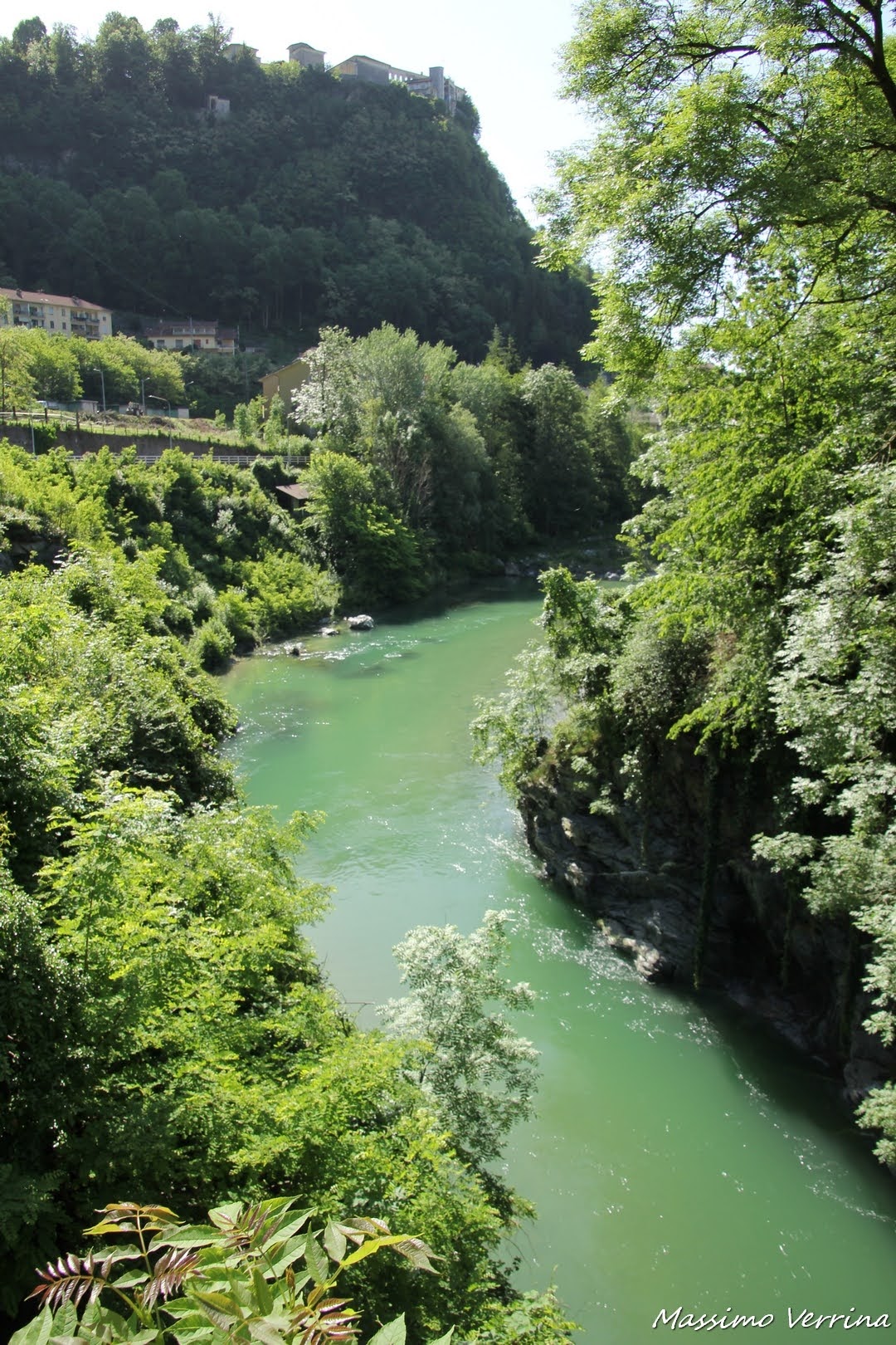 Passata la chiesetta attraverso un ponte dove scorre un bellissimo torrente che illuminato dal sole assume una colorazione verdissima, molto particolare…