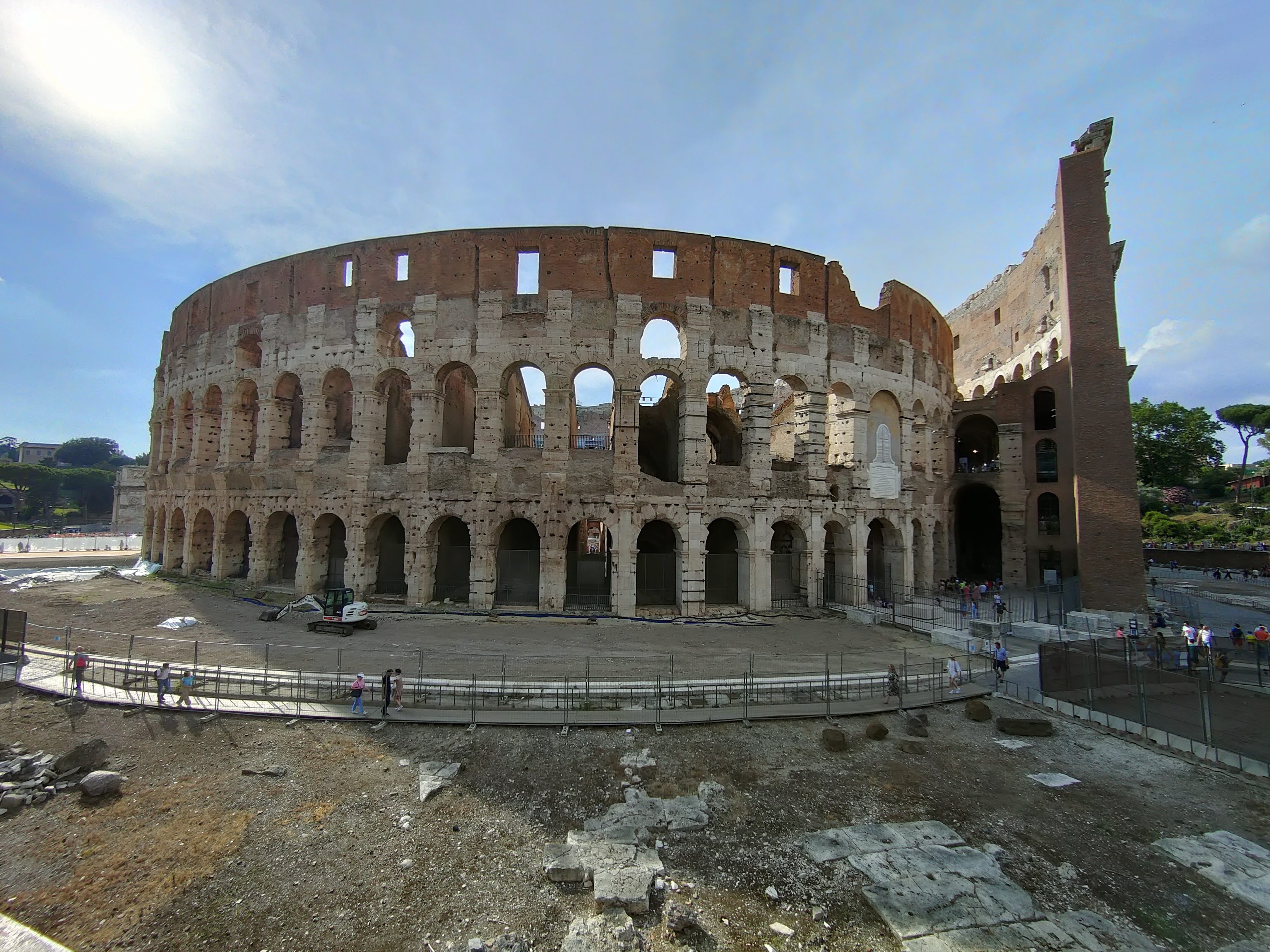 Con le prossime immagini vi faccio vedere col grandangolare i due volti del Colosseo, questo del prossimo scatto è il volto più noto, la sua parte frontale, dove ci si mette in coda per entrare. Notate le mura più alte che cingono al loro interno la parte più bassa che da qui non si vede…