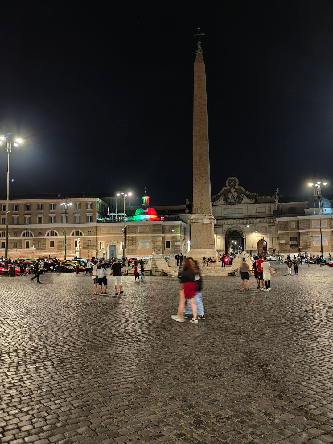 Da Piazza del Popolo le ultime Ferrari partono con rombi di motore che è impossibile non sentire, mentre sullo sfondo ecco la bandiera italiana rappresentata da quella bellissima illuminazione che mi ha colpito all’istante…