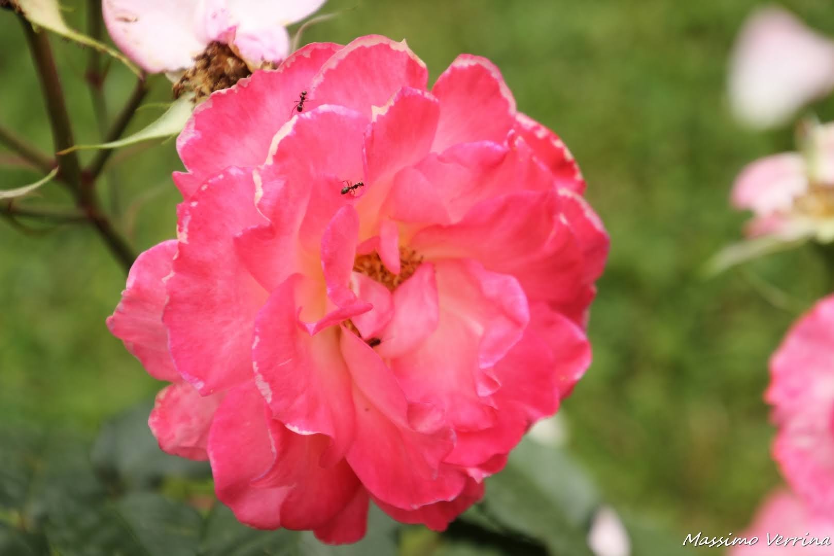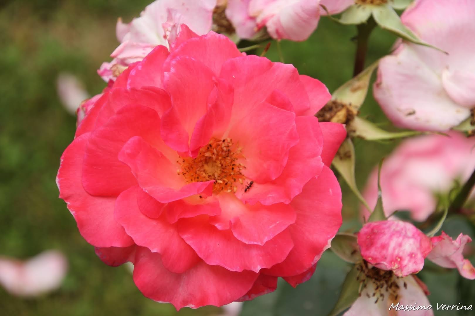 In questo vastissimo Giardino ci sono anche delle rose antiche, eccone una al centro di un prato, l’inquadratura larga mi ha permesso di cogliere anche i petali a terra, ma ora andiamo a vederla da vicino…